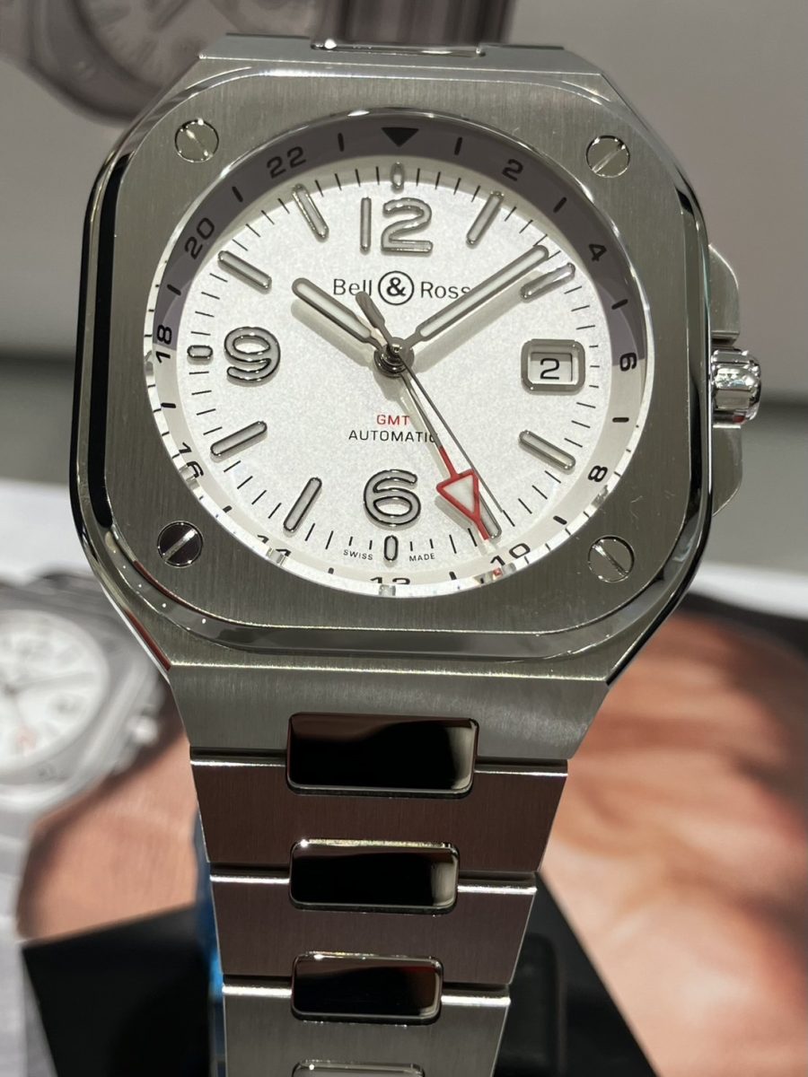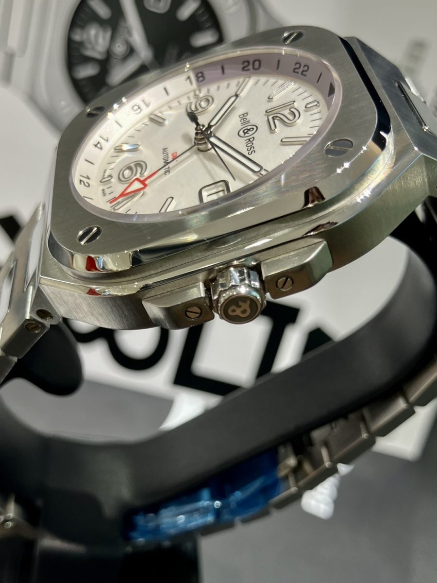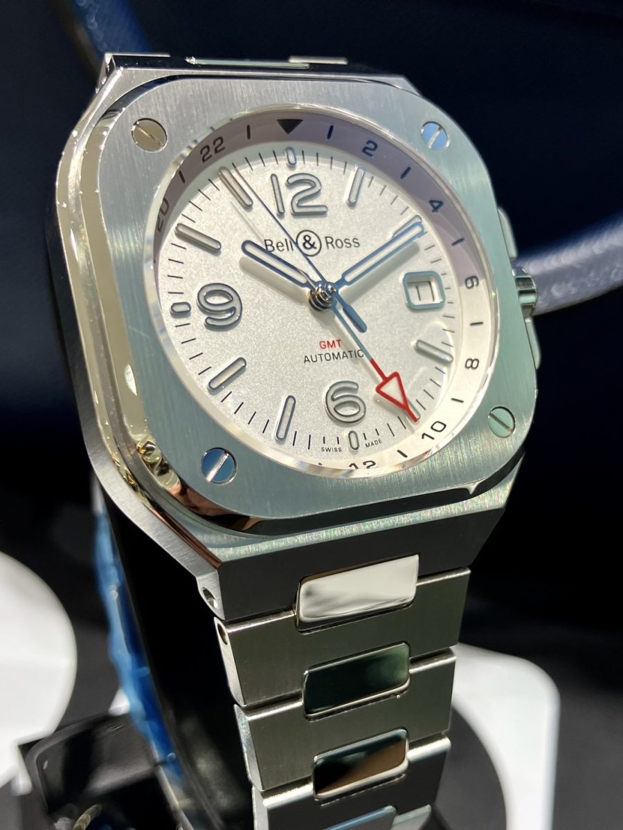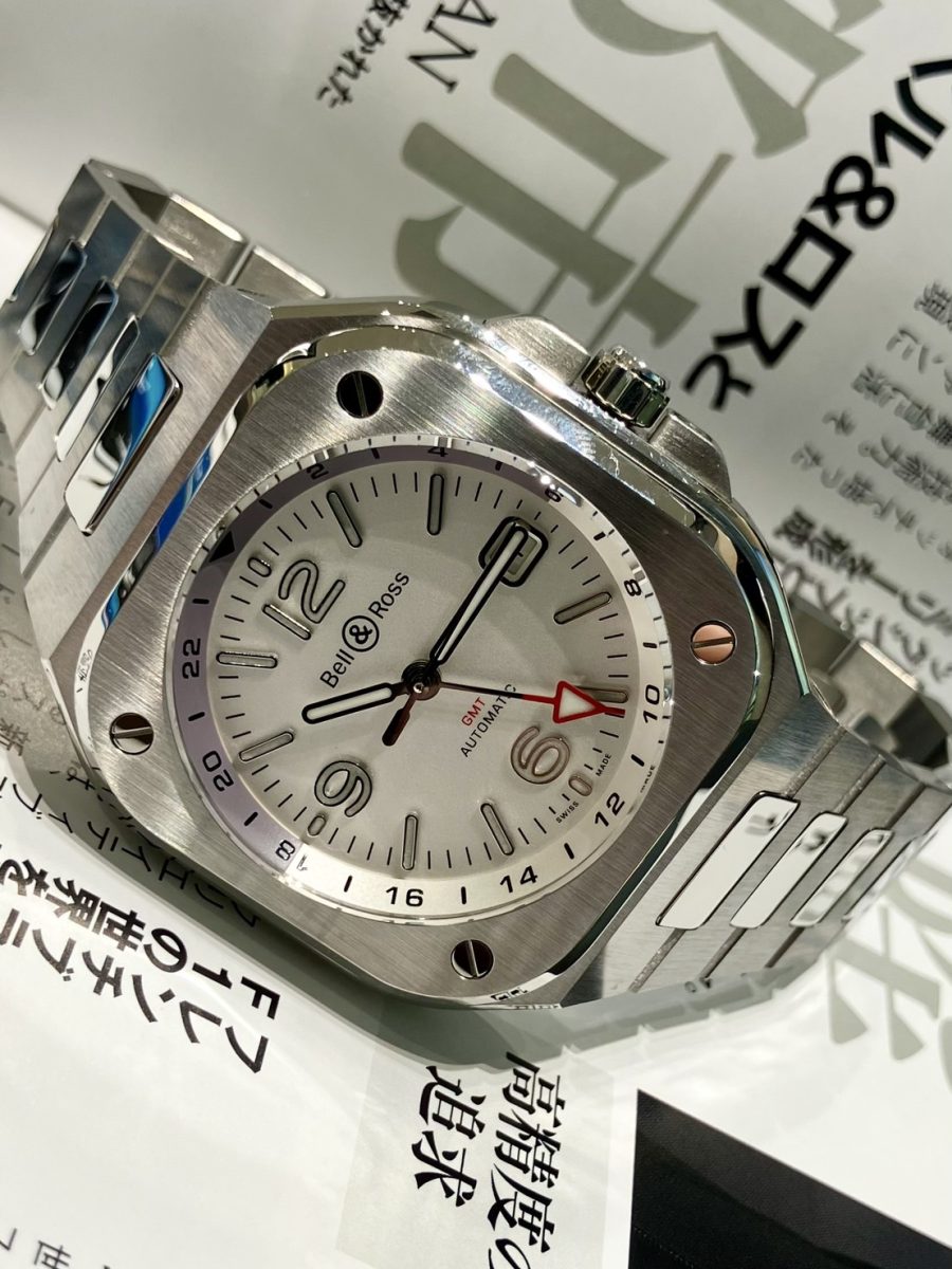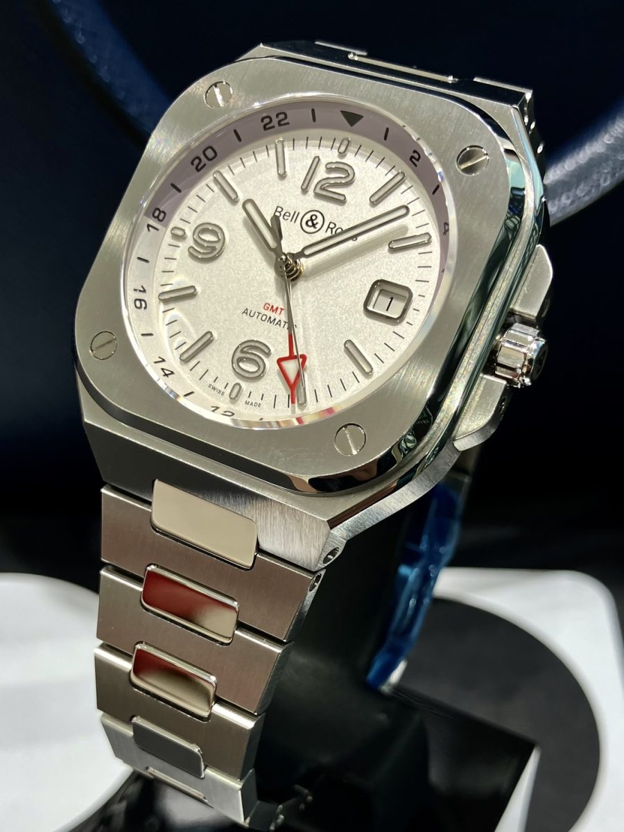 「ベル&ロス」を象徴するラウンドとスクエアを組み合わせたアイコニックなケースに、一体型のブレスレット✨⌚️✨メタリックなホワイトにメッキ加工を施す事で真珠の様な光沢を纏わせた「オパライン仕上げ」の文字盤と、赤いアロー型GMT針のカラーコントラストが華やかなアクセントとなっております😊