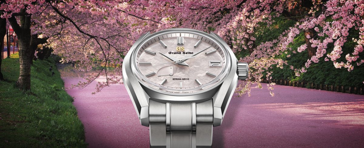 桜が散ってもなお愛でるという日本ならではの趣がある風景を、岩肌のような型打ちパターンを取り入れたダイヤルに繊細なシルバーグレーのピンク色を組み合わせる事で表現