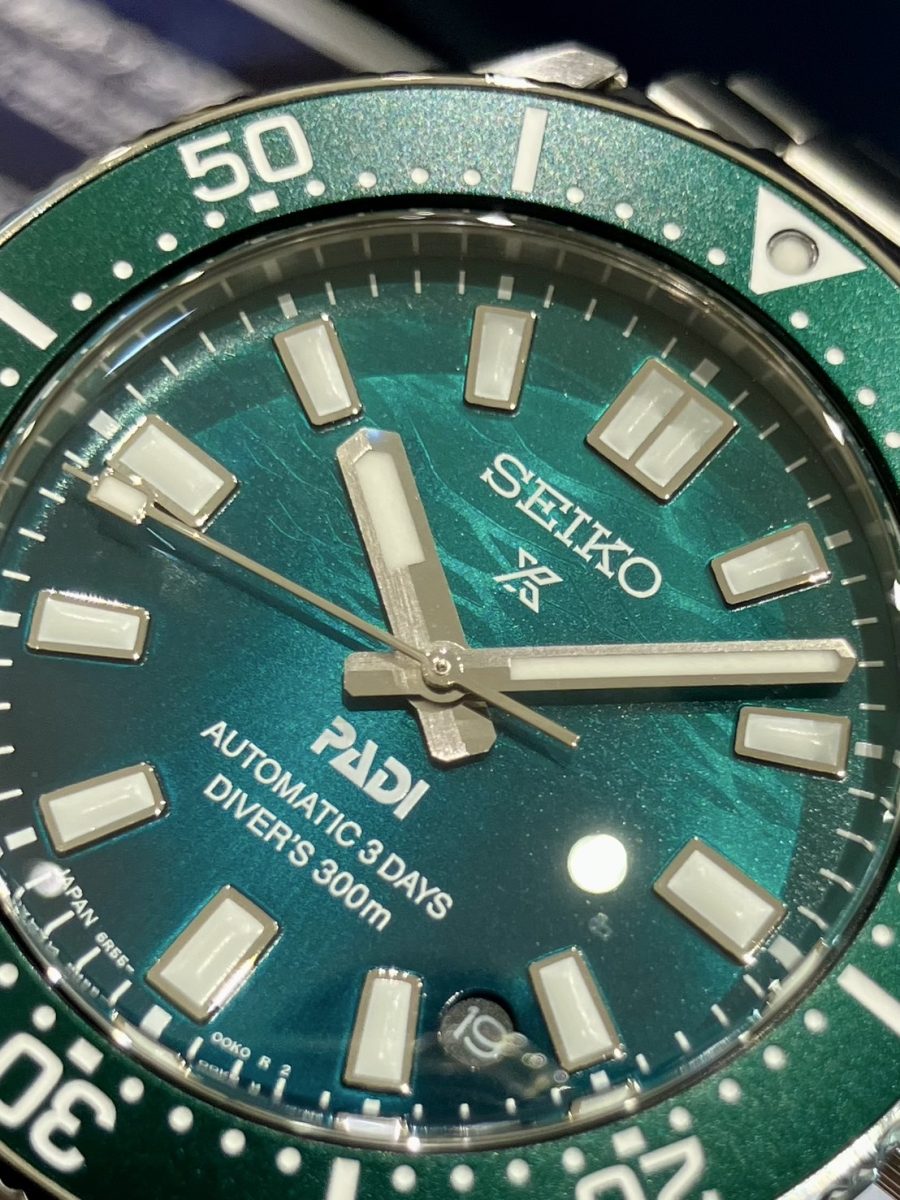 「セイコー・プロスペックス」と「PADI」との協業は10年に及び、こちらの「PADI スペシャル・エディション」は、水中から見上げた降り注ぐ光と水面の揺らぎをモチーフとしたエメラルドグリーンのグラデーション文字盤がとても美しく、海底から水面へと移ろう色彩を巧みに表現し、まるで腕元に小さな海を宿しているかのような情景が広っております☺️🏝️