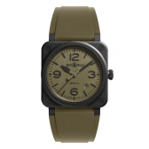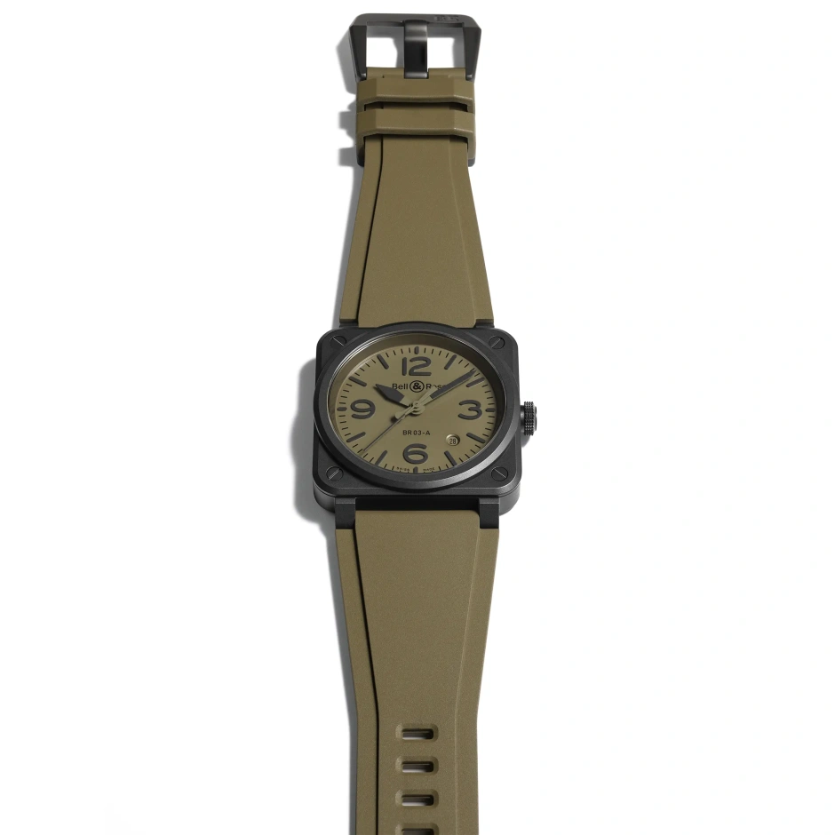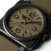 航空機のコックピットの計器から着想を得た独創的なデザインが特徴の、ベル&ロスのインストゥルメント・ウォッチ「BR 03」が41mm径にサイズ変更しモデルチェンジ。厚みもステンレススティールケースで9.9mmから9.6mmへとコンパクトに、パワーリザーブは54時間にアップグレードされました。 傷に強く軽量なハイテクセラミックケースを採用。 カーキのラバーベルトの他、ブラックのファブリックベルトが付属されております。