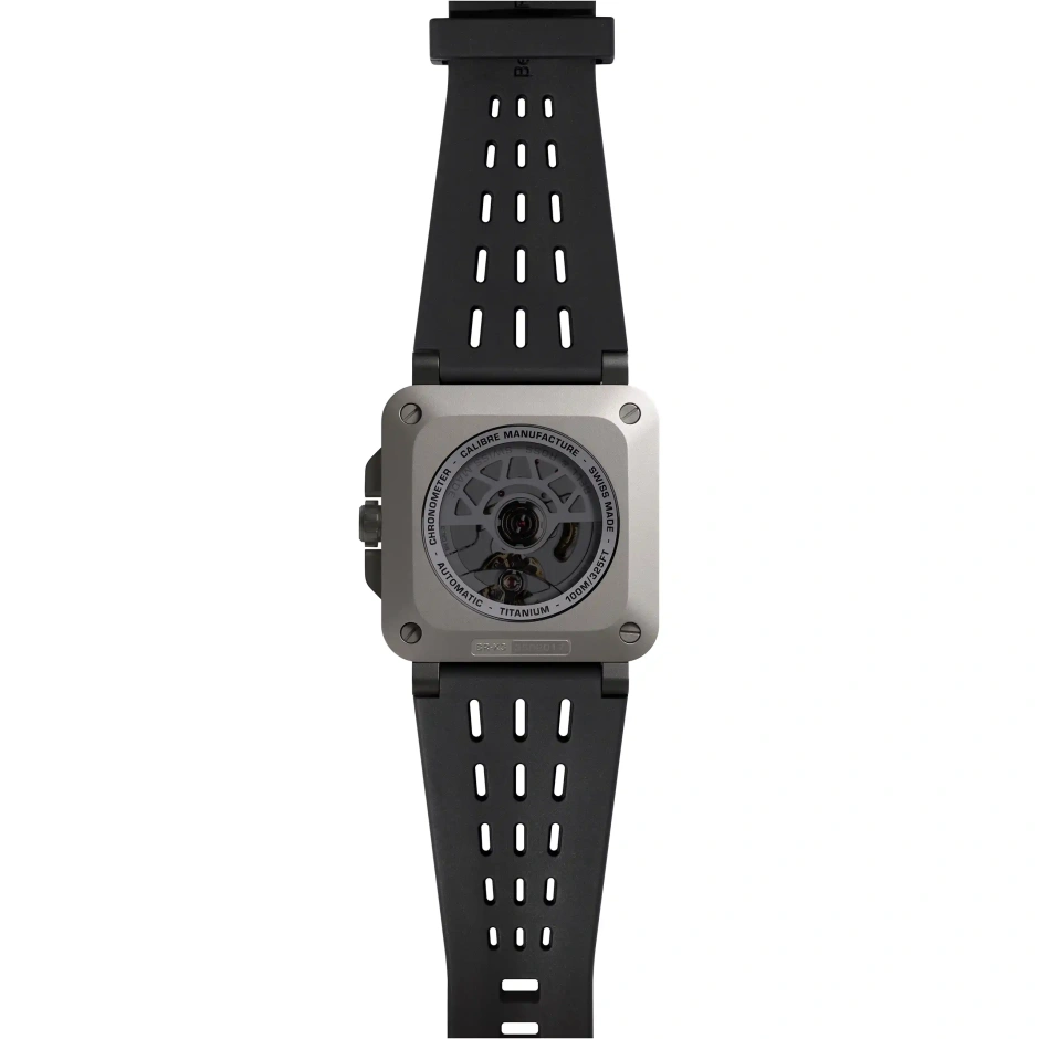 BR-X3 Black Titaniumは軽さと耐久性を極め、多層チタンケースのサンドイッチ構造により、高度な技術と快適さを両立させています。文字盤は印象的なX型デザイン。3時位置のデイト表示と9時位置のパワーリザーブはマットグレーで縁取られています。60分目盛り付きのフランジにセットしたメタルインデックスと蓄光針により、昼夜を問わず文字盤の視認性を実現しました。