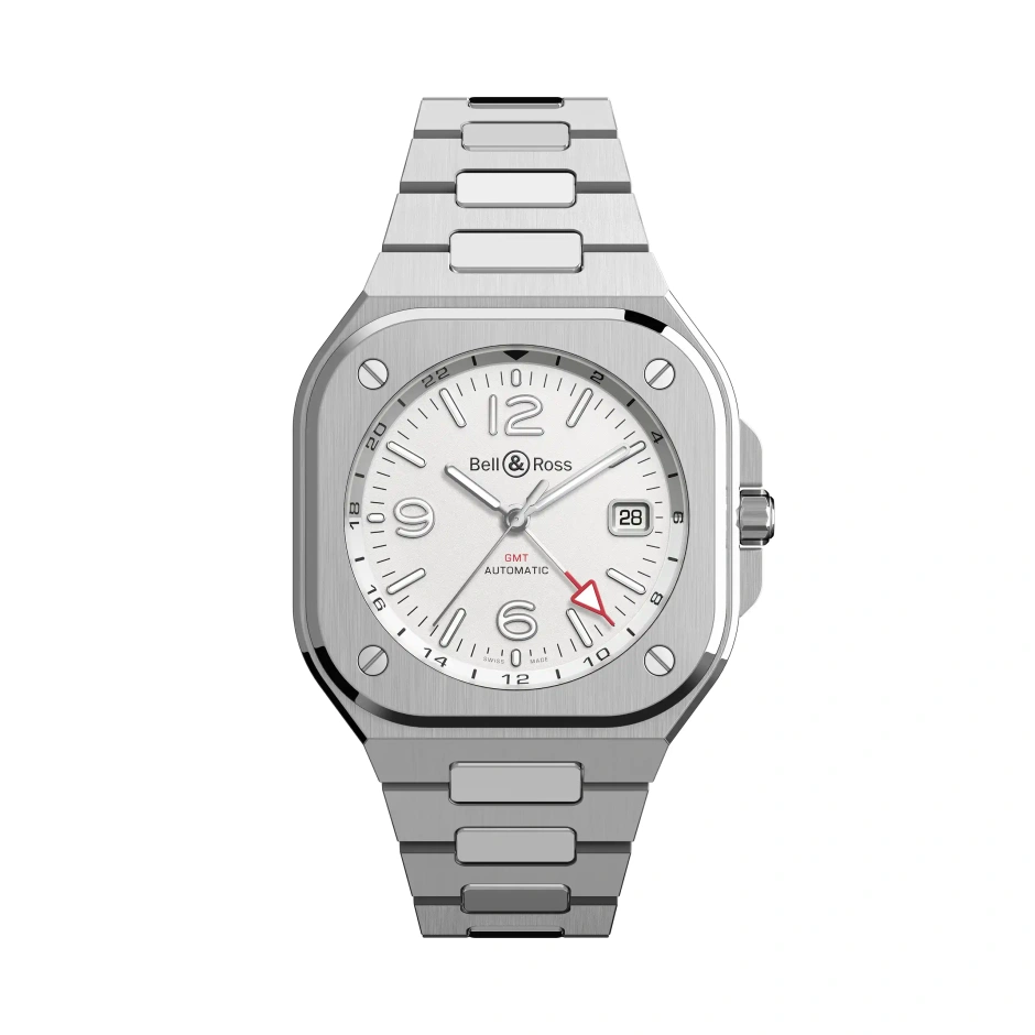 世界の2つの異なる時間帯を同時に表示する「GMT機能」を備えたモデルとなっております。ベル&ロスを象徴するラウンド&スクエアのケースと多面カットにテン仕上げのプレートと鏡面仕上げの中ゴマを組み合わせた流麗なブレスレット。 赤いアロー型のGMT針が、昼夜をひと目で読み取れるようホワイトとグレーに分かれた24時間目盛り付きインナーベゼルを指しています。