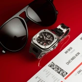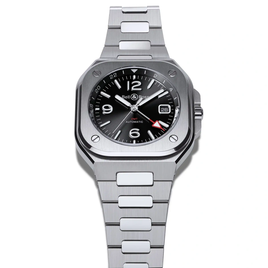 世界の2つの異なる時間帯を同時に表示する「GMT機能」を備えたモデルとなっております。ベル&ロスを象徴するラウンド&スクエアのケースと多面カットにテン仕上げのプレートと鏡面仕上げの中ゴマを組み合わせた流麗なブレスレット。 新たに搭載された赤いアロー型のGMT針が、昼夜をひと目で読み取れるよう ブラックとグレーに分かれた24時間目盛り付きインナーベゼルを指しています。