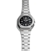 ラウンドとスクエアを組み合わせたアイコニックなケースデザインにブラックのサンレイ仕上げ文字盤が光を受けて輝き、腕元を華やかに演出。抜群の装着感を誇る多面カットにサテン仕上げと鏡面仕上げを組み合わせた流麗なブレスレットとのコンビネーションにより、機能性と現代のライフスタイルに寄り添う洗練されたエレガンスが協調されております。