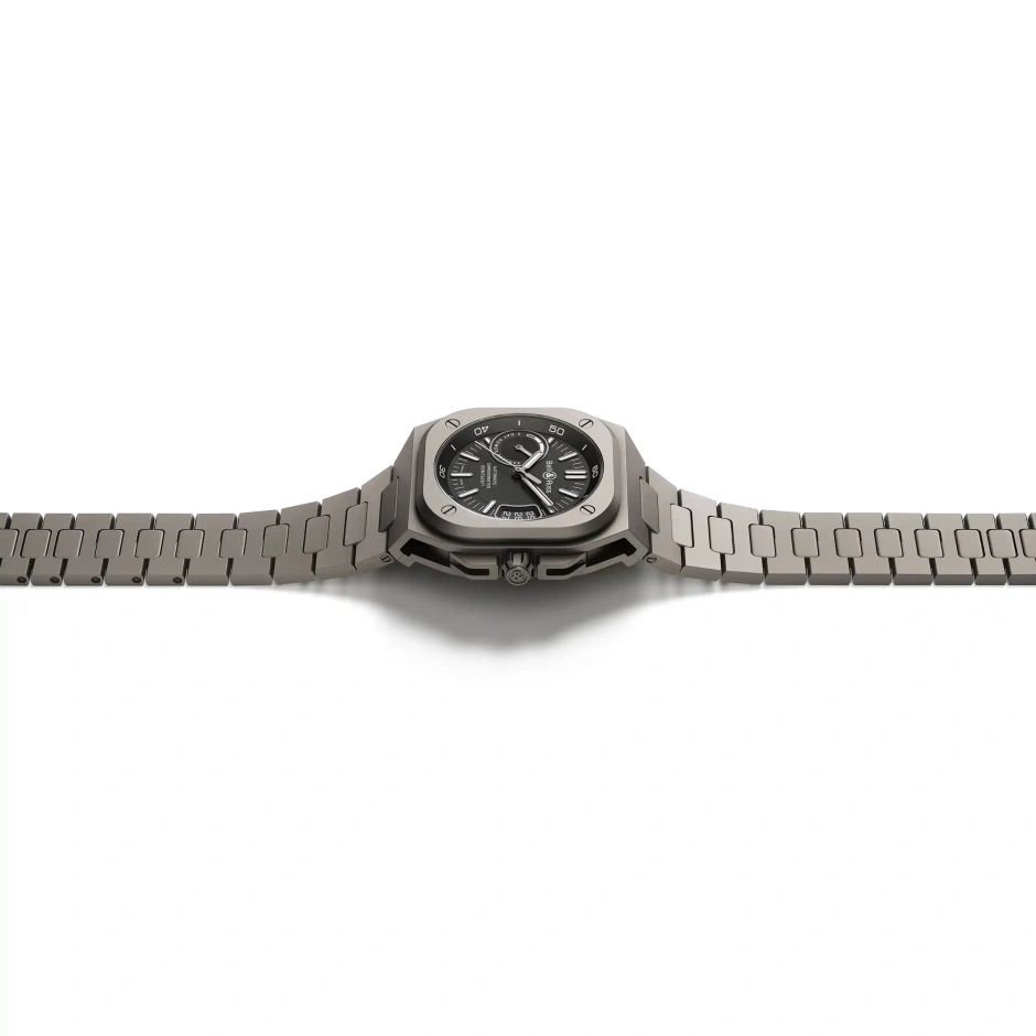 自社製ムーブメントを搭載した「BR-X5」は、BR05コレクションの最上級モデルに位置づけられています。 ケースとブレスレットの素材として、その堅牢性と軽量さ(重量はスティールの3分の1)により、航空技術の分野で好まれている素材であるチタンを選択しました。 マルチコンポーネントのケースは、軽量さと耐久性を兼ね備え、洗練された先鋭的な構造となっており、 低刺激性、耐腐食性、非磁性のチタンは高い実用性と性能を誇ります。 機械式自動巻きムーブメント「BR-CAL.323」は、約70 時間のパワーリザーブと日付の即時修正機能を備え、COSC によるクロノメーター認定の精度を確保。5年間のブランド保証付きです。