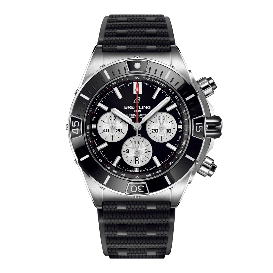 1983年にブライトリングがイタリア空軍のアクロバット飛行チームのために製作した「フレッチェ・トリコローリ」にインスパイアされた「スーパー クロノマット」。 力強さあふれる万能スポーツウォッチでありながら、夜の装いにもマッチするエレガントさを備えています。 ステンレススチール製ケースにブラックのダイヤルとベゼル、そしてコントラストの効いたシルバーのクロノグラフカウンターの組み合わせ。パワーリザーブ約70時間のCOSC公認 自社開発製造キャリバー ブライトリング01を搭載しています。