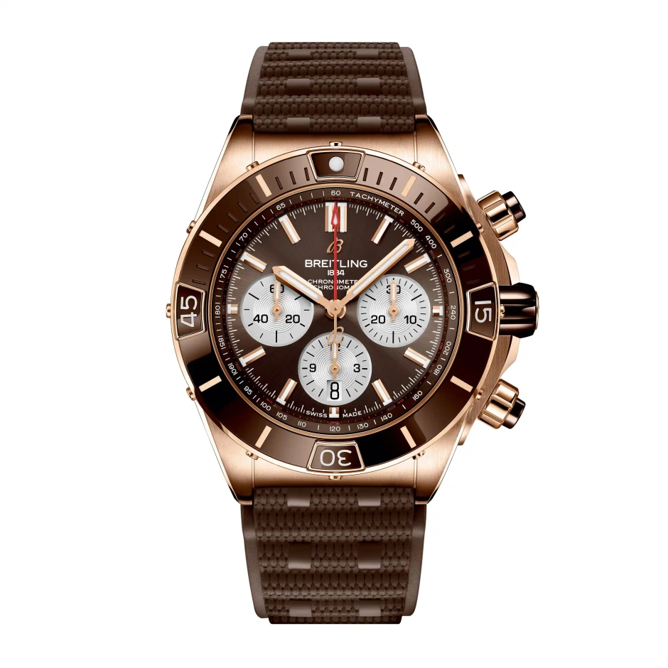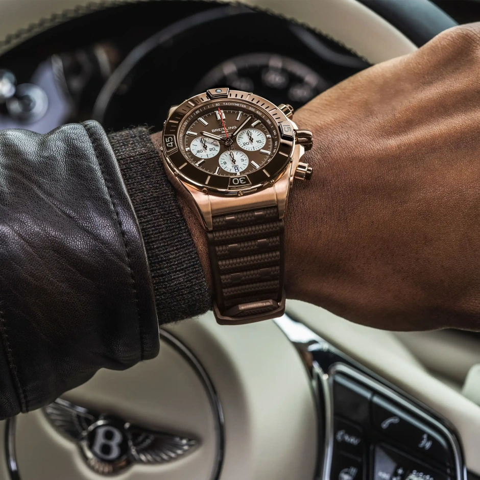 1983年にブライトリングがイタリア空軍のアクロバット飛行チームのために製作した「フレッチェ・トリコローリ」にインスパイアされた「スーパー クロノマット」は、力強さあふれる万能スポーツウォッチでありながら、夜の装いにもマッチするエレガントさを備えています。深みのあるブラウンのダイヤルとベゼルに、18Kレッドゴールドのケース、コントラストの効いたシルバーのクロノグラフカウンターを組み合わせました。パワーリザーブ約70時間のCOSC公認自社開発製造キャリバー 「ブライトリング01」を搭載しています。