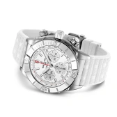 クロノマットの中で最も際立ったモデルであるスーパー クロノマットは、ベゼル、クロノグラフのプッシュボタン、リューズなどにセラミック インサートを使用しており、1980年代にブライトリングがイタリア空軍のエアロバティック・チームのパイロットのために製作したオリジナル・クロノマットのルーローブレスレットにインスパイアされたラバーストラップが特徴です。こちらの日本限定モデルは、アイコニックなセラミックインサートとラバーストラップをホワイトに仕立てた特別仕様。白で統一された外観によりスタイルを際立たせます。COSC公認クロノメーターのブライトリング キャリバー01搭載。