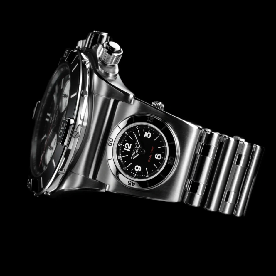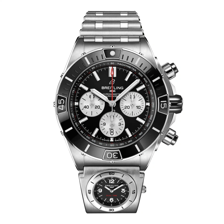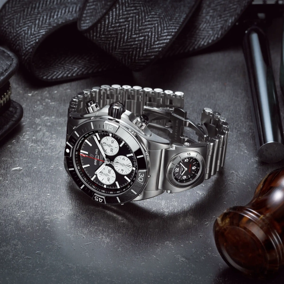 1983年にブライトリングがイタリア空軍のアクロバット飛行チームのために製作した「フレッチェ・トリコローリ」にインスパイアされた「スーパー クロノマット」。 力強さあふれる万能スポーツウォッチでありながら、夜の装いにもマッチするエレガントさを備えています。 ステンレススチール製ケースにブラックのダイヤルとベゼル、そしてコントラストの効いたシルバーのクロノグラフカウンターの組み合わせ。パワーリザーブ約70時間のCOSC公認 自社開発製造キャリバー ブライトリング01を搭載しています。 UTCモジュールをブレスレットに組み込んだ特別仕様。UTCとはUniversal Time Coordinated(協定世界時)の略です。1980年代から提供しているブライトリングのユニークな機能で、第2タイムゾーンを把握するためのものです。