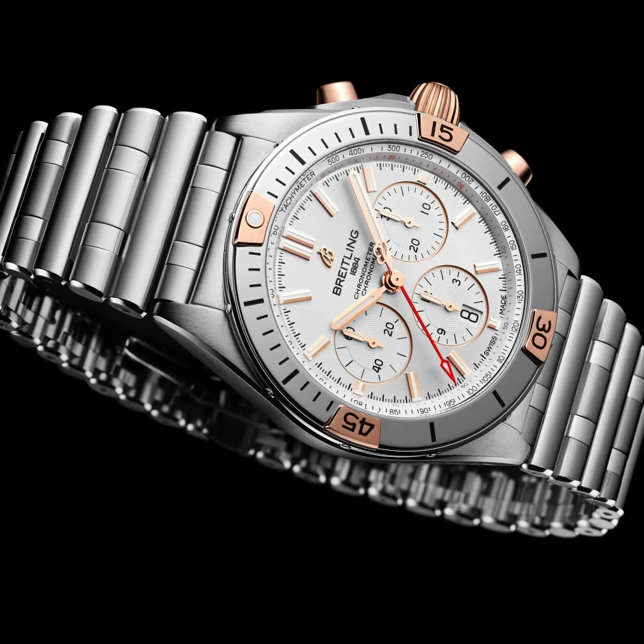 あらゆる要望に応える、ブライトリングの万能モデル。 クロノマットは、ブライトリングの歴史の中で重要な位置を占めるモデルです。 ステンレススチール&18Kレッドゴールドの42ミリケースと4カ所にライダータブを配したアイコニックなベゼル。独特な「ルーロー」ブレスレットがしっくりと馴染みます。 ムーブメントはCOSC公認クロノメーターのブライトリング自社開発製造キャリバー01です。