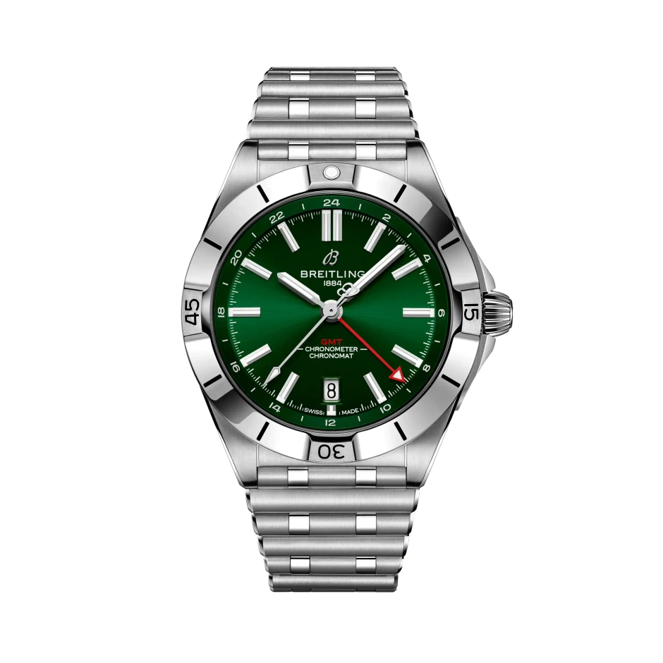 「クロノマット オートマティックGMT 40」は、デュアルタイムゾーン表示や、さりげない美しさからブライトリングの旅行者へのオマージュが感じられるモデルです。繊細なダイヤルカラーは、オールステンレススチールケースとブレスレットと相まって、どんなファッションにもマッチします。同時に、同系色で統一された24時間目盛りをGMTの赤い針がうまく引き立たせています。