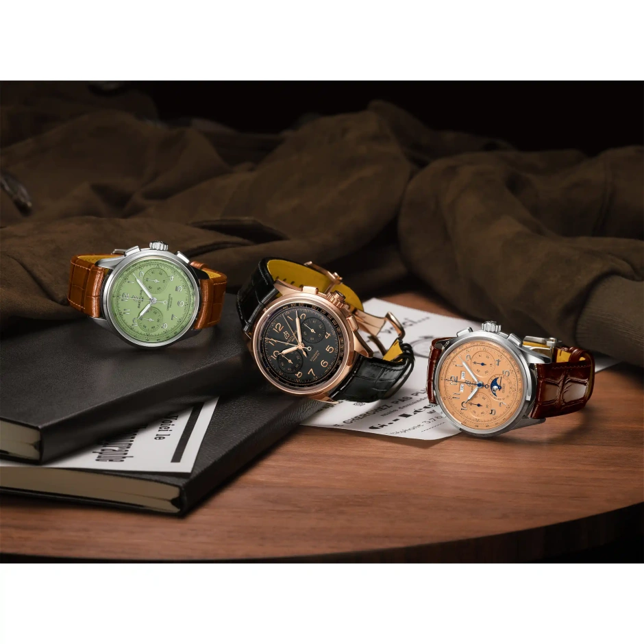 レオン、ガストン、ウィリー・ブライトリングという3世代の創業家へのオマージュを込めたプレミエ クロノグラフは、近代のクロノグラフラフを発明したブライトリングのレガシーを体現したものです。長方形のクロノグラフプッシャー、バイコンパックス・クロノグラフ、アラビア数字の特徴に加え、ケースサイドの溝、サファイアのオープンケースバック、ヴィンテージ風の針などエレガントなデザインディテールが様々に施され、手巻き式のCOSC認証を受けたブライトリングマニュファクチュールキャリバーB09で駆動します。