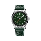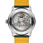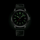 グリーン、ブルー、またはホワイトとスカイブルーのツートーンの3色展開で、3連ステンレススチールブレスレットまたはレーシンググローブを彷彿とさせるパンチング加工のカーフスキンストラップと組み合わせることができます。