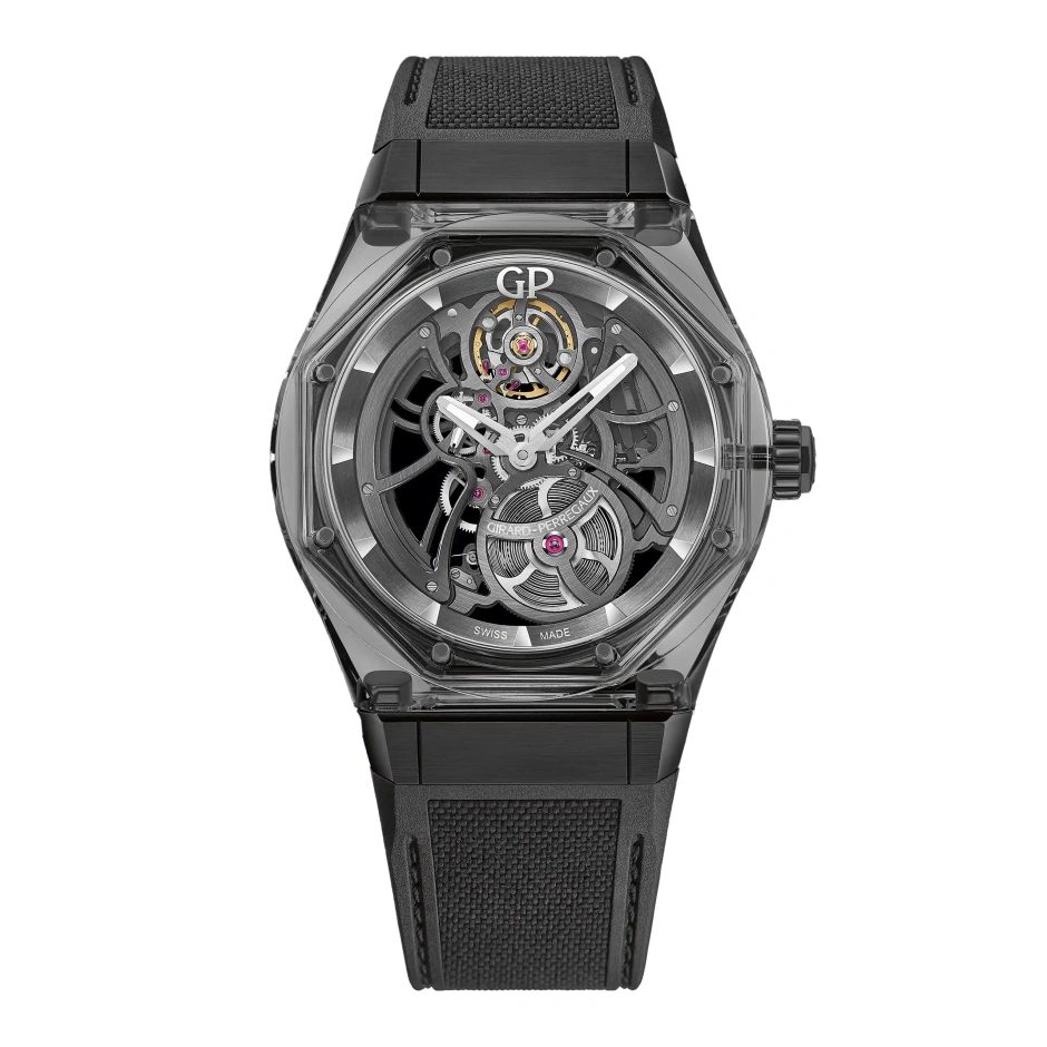 スケルトン仕様により、安定性と耐衝撃性に優れる可変慣性テンプを取り入れた自社製造キャリバー「GP01800-1143」の精巧な仕上げを鑑賞頂けます。