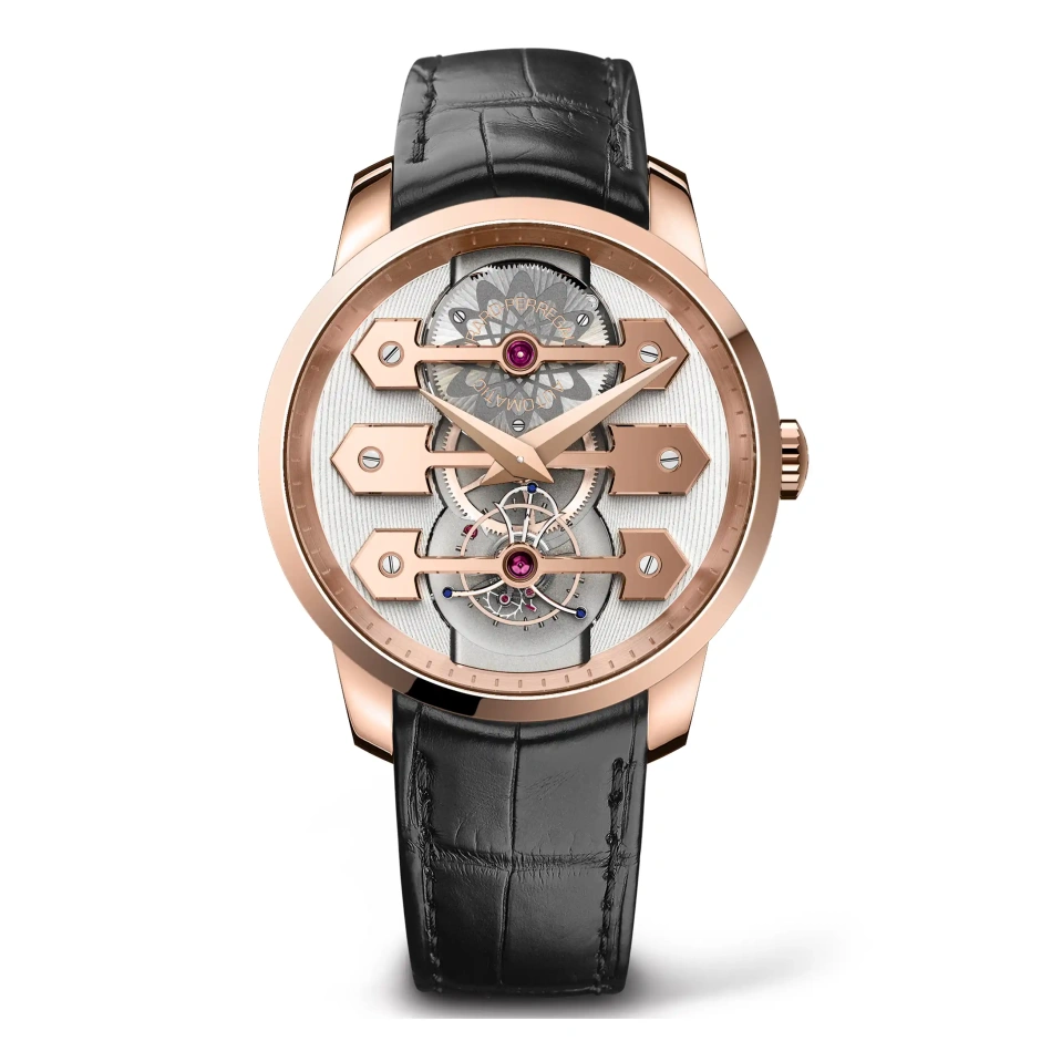 煌びやかな18Kピンクゴールドのケースに配置されたブランドの象徴でもある3本の「矢形ブリッジ」は小さなツゲの木を用いて丁寧に磨き上げられており、一組のスリー・ゴールドブリッジを仕上げる為に熟練の職人が40時間もかけて創りあげております。