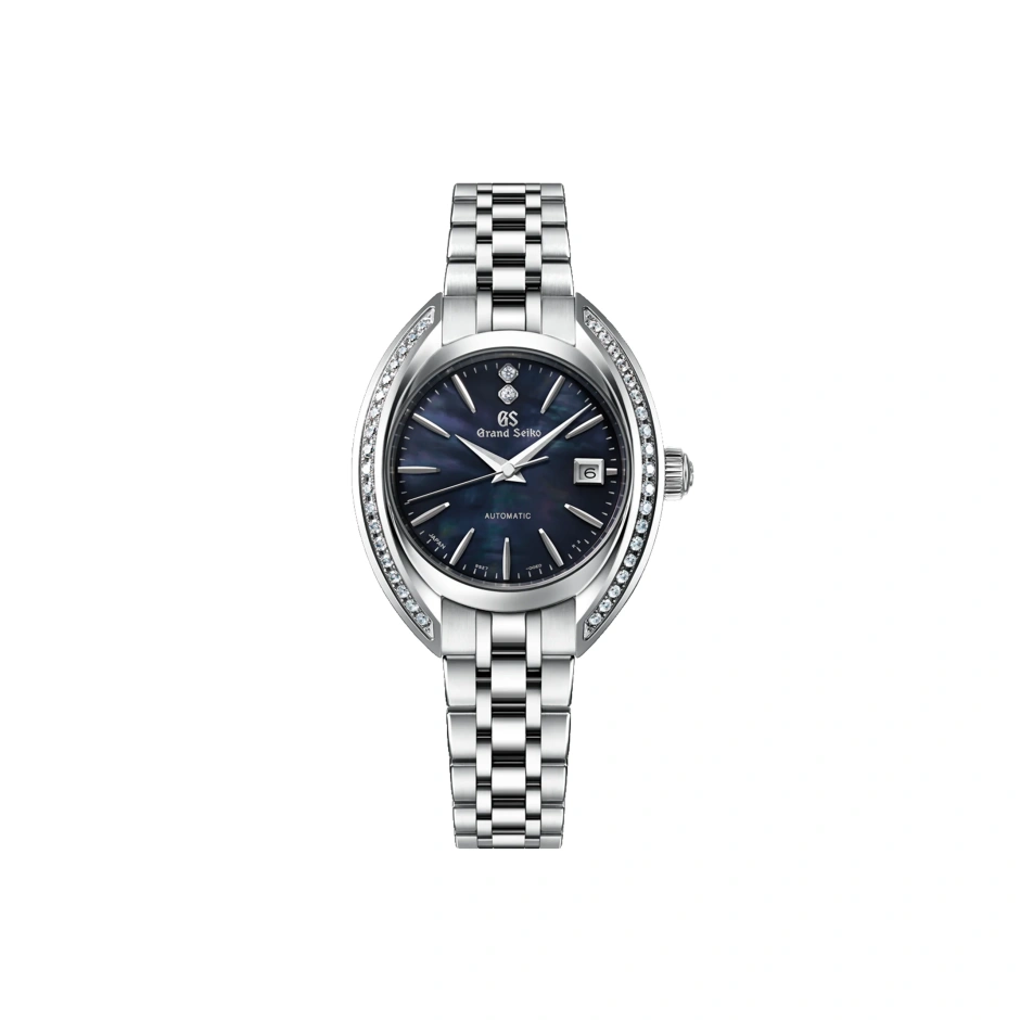 瞳や水滴、女性のボディラインといった、自然が生み出す歪みのないカーブフォルムから着想をえて、シンプルな中に見えてくる女性的な美しさを追求したデザインです。 ケースのベゼル(ガラスの周りに取り付けられるリング状のパーツ)をなくすことで、両サイドの造形を際立たせるデザインです。ドーム状のサファイアガラスを包み込むように大きなアーチを描くグラマラスなカーブフォルムは、女性の手元を美しく演出するとともに、腕に優しくフィットします。 ガラスサイドの大きなアーチにダイヤモンドをセッティングしている部分がこのモデルの象徴といえます。トップを揃えながら複数のサイズの石を組み合わせて立体的にセッティングすることで、あらゆる角度の光を取り込み、流れるような美しい輝きを放ちます。ダイヤモンドの回りのケース部分にグランドセイコーならではの研磨を施し、歪みない金属の鏡面とシャープなラインがダイヤモンドと完璧に調和します。熟練した職人による匠の技で、貴石を傷つけず平滑に磨き上げています。 腕元を品良く彩る「深紫(こきむらさき)」のダイヤル。上品な深紫の色味が、奥深さとモダンさ演出し、白蝶貝の艶めきは女性のその日その時の気持ちに寄り添い、身に着けるシーンに呼応するかのように表情を移ろわせます。