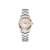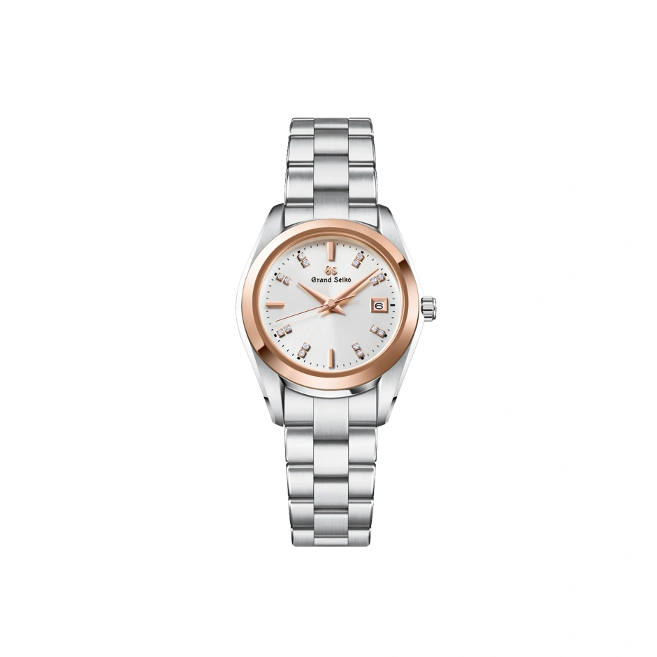 グランドセイコーとしての高い基本性能と機能美はそのままに、女性の手元に合わせて繊細な作り込みが施されたクオーツモデルです。 歪みのない美しい鏡面仕上げが施された面と、きめ細やかな筋目仕上げが施された面の、対照的な2つで巧みに構成されたケースは、フォルムの美しさが際立ち、繊麗な輝きを放ちます。 ベゼルに用いられている18Kピンクゴールドと、インデックスにセットされたダイヤモンドが、優艶な表情を作り出しています。