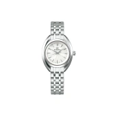 瞳や水滴のような自然が生み出す歪みのないカーブフォルムから着想を得たデザイン。シンプルな中に見えてくる柔和な美しさを追求したモデルです。ダイヤモンドのように煌めくブリリアントパターンの白いダイヤルは、12 時位置に配置されたワンポイントのダイヤモンドの輝きとあいまって、明るく凛としたデザインで、どのようなシーンにもご着用いただけます。 また、ケースはベゼル(ガラス縁)をなくすことで両サイドの造形をより際立たせるデザインに仕上げています。ドーム状のサファイアガラスを包み込むように大きなアーチを描くグラマラスなカーブフォルムは、女性の腕元を美しく演出します。