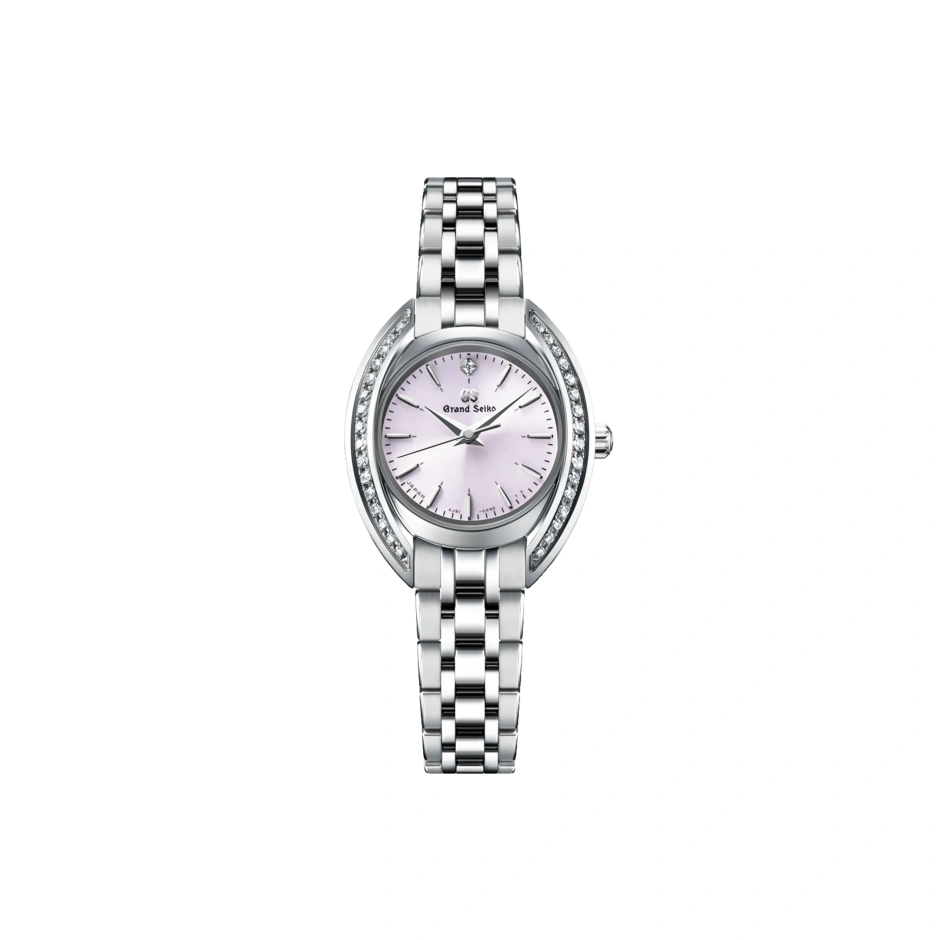 瞳や水滴、女性のボディラインといった、自然が生み出す歪みのないカーブフォルムから着想を得た、シンプルな中に見えてくる女性的な美しさを追求したデザインを持つ小ぶりなモデルです。 ケースのベゼルをなくすことで、両サイドの造形をより際立たせるデザインに仕上げました。ドーム状のサファイアガラスを包み込むように大きなアーチを描くグラマラスなカーブフォルムは、女性の腕元を美しく演出します。27.4mmまで縮小したケースサイズと相まって、女性の腕に優しくフィットします。 このモデルを象徴するのは、ガラスサイドの大きなアーチにダイヤモンドをセッティングしている華やかなポイント。トップを揃えながら複数のサイズの石を組み合わせて立体的にセッティングすることで、あらゆる角度の光を取り込み、流れるような美しい輝きを放ちます。ダイヤモンドの回りのケース部分にグランドセイコーならではの研磨を施し、歪みない金属の鏡面とシャープなラインがダイヤモンドと完璧に調和します。熟練した職人による匠の技で、貴石を傷つけず平滑に磨き上げています。 ダイヤルカラーには日本の伝統色である「淡藤色」を採用。藤色は平安時代から女性に人気の色で、染色技術が発達した江戸時代には「藤」の名を冠する多くの派生色が生まれたと言われています。優しく女性らしい「藤色」をさらに淡くした「淡藤色」のダイヤルが、12 時位置に配置されたワンポイントのダイヤモンドの輝きをより一層引き立て、女性の腕元を華やかに演出します。