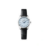 凍った湖上に出現する氷の筋道が太陽光を反射して放つ微細な輝きのような、淡いブルーのダイヤルは、インデックスのダイヤモンドやブルースチールの青い秒針と相まって華やかな印象に仕上げられています。