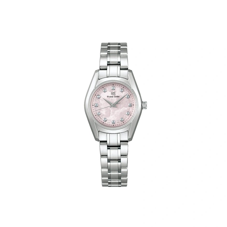 「62GS」の中でも高い支持を得ている「花筏(はないかだ)」に、26mmスモールサイズのクオーツモデルが加わりました。1967年発売のグランドセイコー史上初の自動巻機械式モデル「62GS」を現代的にアレンジした「62GS現代デザインモデル」をベースとし、日本特有の季節の移ろいをダイヤルで表現したモデルです。ベゼル(ガラス縁)のない構造によって広々と見えるダイヤルや、ザラツ研磨によって実現したシャープな多面体からなるケースが魅力です。ダイヤルは、風に舞い散った桜の花びらが川の水面を覆う「花筏」の情景を表現しています。ケースデザインは、小さいながらも高い視認性を確保。シンメトリーに配したダイヤモンドが生み出す、華やかで心地よいダイヤルに仕上げました。ムーブメントは、年差±10秒のクオーツ「キャリバー4J51」を採用しています。