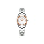 どんな装いにも合わせやすい、ケース幅26mmの小ぶりなサイズのレディス・クオーツモデルです。 ダイヤルに使用されている白蝶貝は、しとやかな光を湛え、角度によってほのかに輝きを放ちます。 ベゼルに用いられた18Kピンクゴールドと、11ヶ所にセッティングされたダイヤモンドが、手元を華やかに彩り、エレガントな時を演出してくれます。