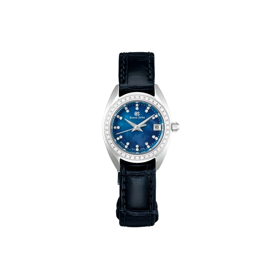 随所にあしらわれたダイヤモンドが、華やかでラグジュアリーな時を演出するレディス・クオーツモデルです。 ベゼル、インデックスに加えて、りゅうずにもダイヤモンドをセッティングした、18Kホワイトゴールドのケースにふさわしい特別仕様です。 上質なネイビーのレザーストラップが、ホワイトゴールドのケースを引き立てるとともに、洗練された大人の女性を演出します。 中留に採用した三つ折れ方式は、美錠タイプに比べてレザーストラップを傷つけにくく、また18Kゴールド製ながらスクリューバックを採用したことで10気圧防水も実現しました。 ケース幅は26mmの小ぶりなサイズで、最高峰の研磨技術を施したメリハリのある鏡面で構成された外装は、最上級の輝きに満ちた仕上がりです。