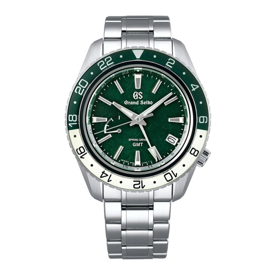 グランドセイコーのスプリングドライブウオッチは、穂高連峰を望む「信州 時の匠工房」で、熟練の職人によるハンドメイドで作られています。遥か昔の火山活動で大陸が激しく隆起して生まれた穂高連峰は、長い年月の風雪に山肌を削られてダイナミックな山岳地帯になりました。 その急峻な岩稜を表現する有機的なダイヤルパターンを施した「SBGE295」は、穂高の短い夏の鮮やかな情景から着想を得たグリーンのダイヤルが印象的なモデルです。 ムーブメ ントには、GMT 機能付きのスプリングドライブムーブメント「キャリバー9R66」を搭載しています。そして、サファイアガラス製の回転ベゼルとダイヤルリングに示された 24 時間 表示によって、3つのタイムゾーンの時刻を知ることができます。