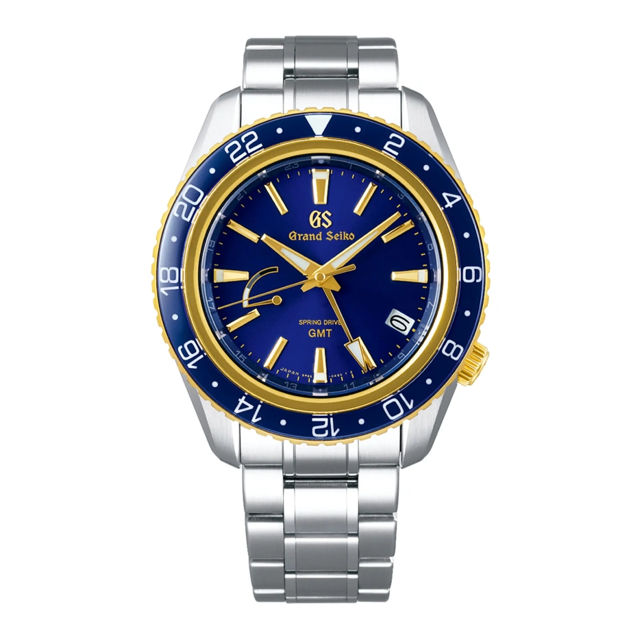水平線に浮かぶ朝日を思わせるようなブルー×ゴールドのコントラストが、リゾートカジュアルと相性の良いスポーティーなカラーリング。 グランドセイコー史上初となる18Kイエローゴールドを用いた回転ベゼルに、りゅうずや中留のGSロゴワッペンにも大胆に採用された18Kイエローゴールドは、従来のスポーツコレクションにはない艶感のあるデザインを実現しています。 ベゼルの表面には、リング形状にくり抜いた青色のサファイアガラスを採用したことで、華やかなデザインの中に硬質な透明感と奥行き、深みが現れています。 ムーブメントには機械式時計に用いられるぜんまいを動力源としながらクオーツ式時計と同等の高精度を可能にしたスプリングドライブを採用。最大巻上時の持続時間が約72時間(約3日間)であることに加え、GMT表示機能により海を越えた先のタイムゾーンを指し示す機能性も兼ね備えたこのモデルは、リゾートシーンはもちろんビジネスシーンにもふさわしい一本です。