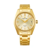 グランドセイコー独自のデザイン哲学「グランドセイコースタイル」を確立した44GS。その哲学を受け継ぎながら、現代の解釈を加えた「44GS 現代デザイン」は、耐久性・装着性を高め、様々な機能を有するムーブメントに対応できるよう、より立体的な造形へと進化しました。 ムーブメントにはスプリングドライブ「キャリバー9RA2」を搭載。パワーリザーブ表示を裏側に配置することで、ダイヤルに広がりが生まれます。ダイヤルの上を音もなく滑らかに動く秒針は、自然な時の流れを体現するとともに、月差±10秒という高精度を実現しています。 18Kイエローゴールドケースは、ザラツ研磨による歪みのない広い鏡面が連なり、ダイナミックな光の移ろいを楽しめる造形が特徴です。素材本来の光の反射性が引き出され、より力強い輝きを放ちながらも奥深く洗練された品格を漂わせます。ゴールドカラーのダイヤルは、かつてシルクの一大生産地だった工房のある諏訪地域のものづくりの歴史に敬意をこめて、シルクのような美しい肌理と艶やかさをもつ、極めて繊細な放射模様に仕上げました。ブレスレットは18Kイエローゴールドの確かな重量感を感じさせ、しっとりと肌になじみます。細部にもこだわり、装着時の傷をつきにくくした中留は、ブレスレットと一体感をもたせました。