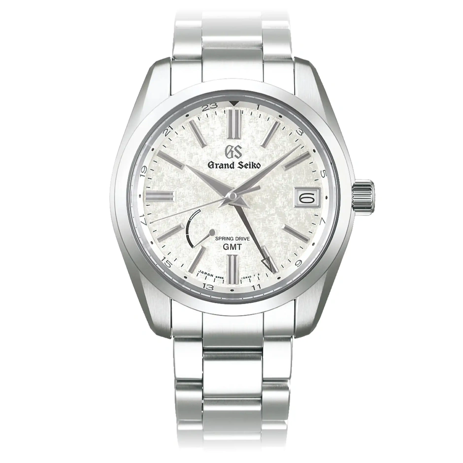 グランドセイコーの王道のケースデザインに、特徴的なダイヤルを組み合わせたGMT搭載モデルです。 機械式時計でありながらもクオーツ時計と同等の高精度を可能にしたクオーツと機械式のハイブリッド機構「スプリングドライブ」。日本の自然の美しさに由来する有機的な型打ち模様を施した雪化粧の様なシルバーダイヤルが腕元を華やかに彩ります。約72時間のパワーリザーブと文字盤から眺められるインジゲーターを搭載し「時は移ろい流れる」の日本らしい美意識を表現する流麗なスイープ運針も必見です。