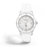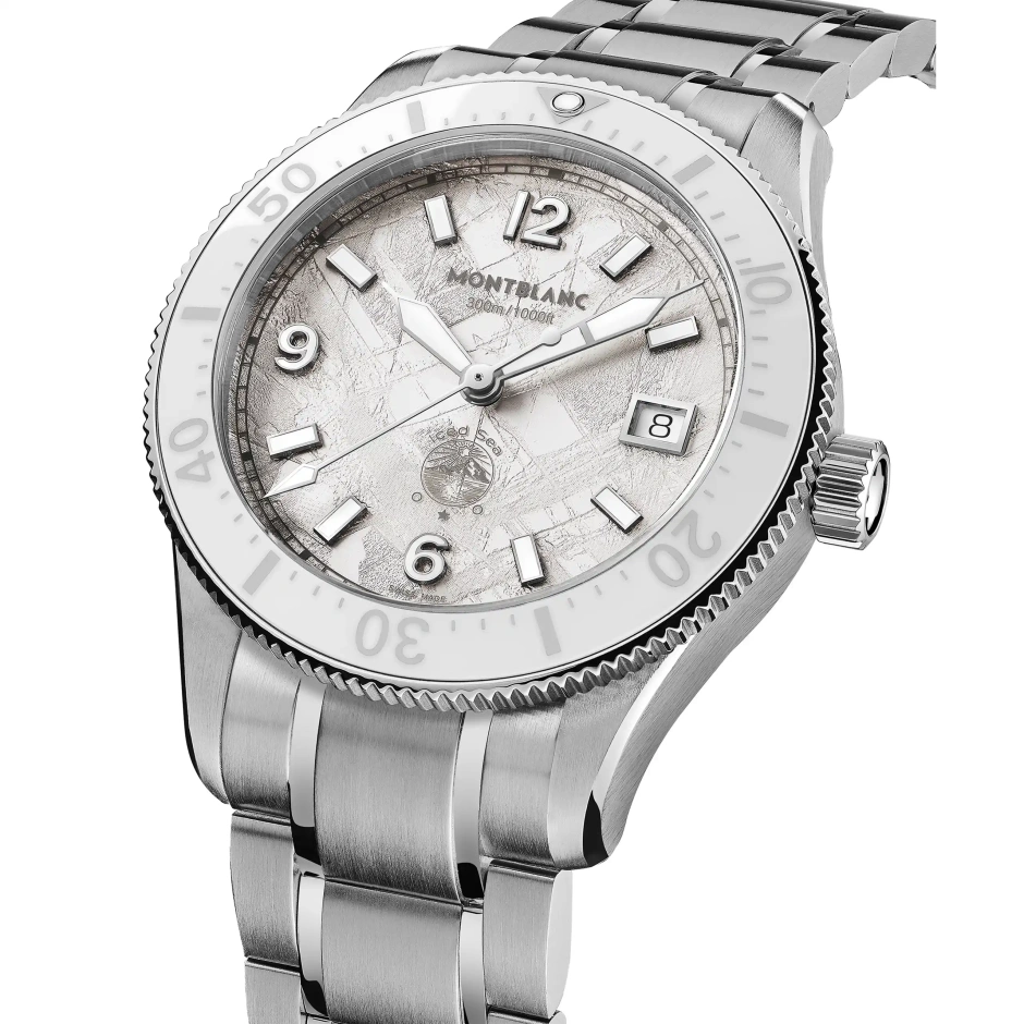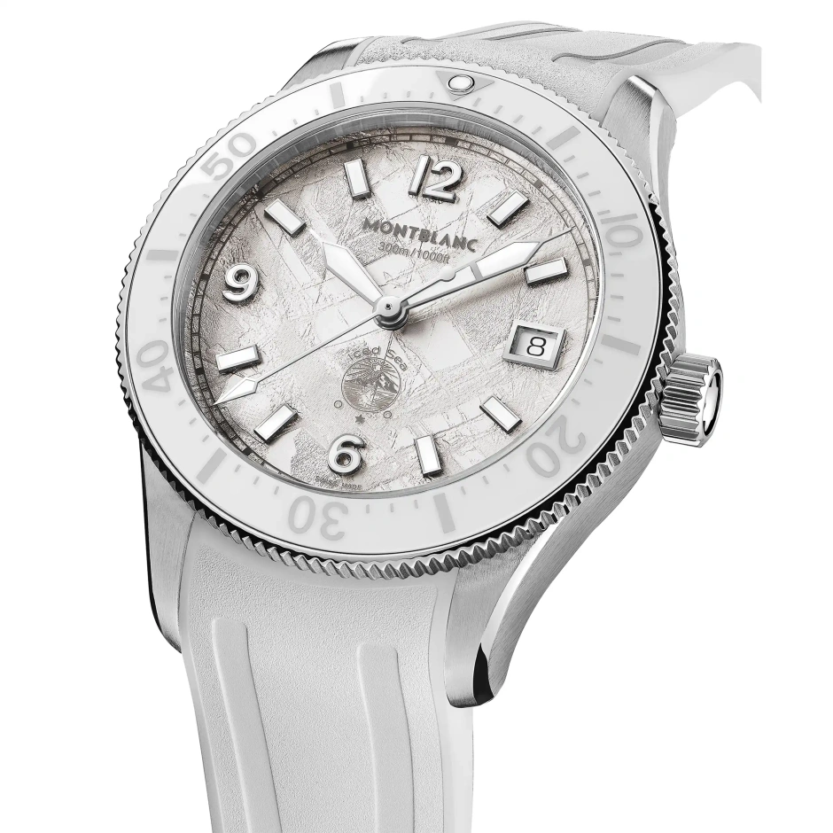 このタイムピースは完全無酸素の38mmステンレススティール製ケースに収められ、ホワイトセラミックのインサートを配した逆回転防止ベゼルと3Dエングレービングが施されたケースバックを備えており、微調整システム搭載の交換可能なステンレススティール製ブレスレットが付属しています。またダイバーズウォッチの国際基準「ISO 6425規格」に準拠し、300mまでの防水機能を備えています。