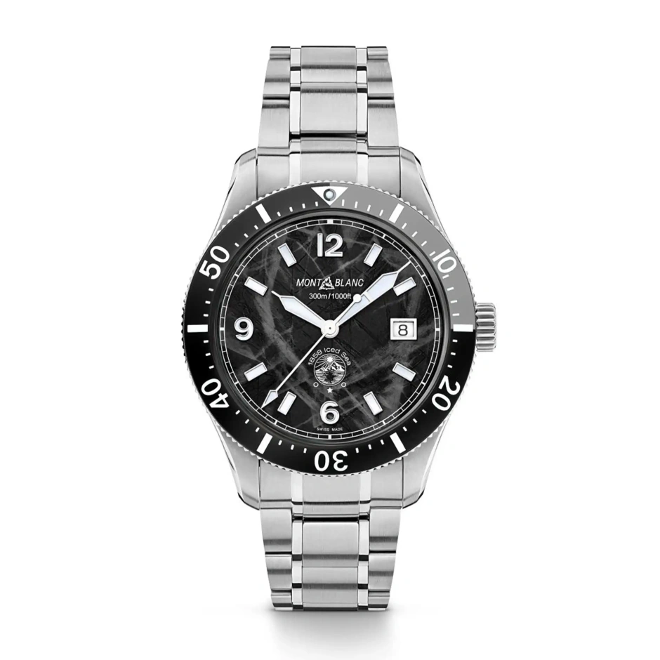 モンブラン初のスポーツダイバーズウォッチ。氷河の奥深さを覗き込む感覚を与えるグレイシャーパターンのダイヤルは、モンブラン山塊の主要な氷河であるメール・ド・グラス(氷の海)からインスピレーションを得て、グラテ・ボワジと呼ばれる先祖伝来の技法で実現されています。このタイムピースには、逆回転防止バイカラーセラミックベゼル、刻印入りケースバック、微調整可能なステンレススティール製ブレスレットが付属し、精度の高い装着感となっております。また、ダイバーズウォッチのISO 6425規格に準拠した300mまでの防水機能を備えています。