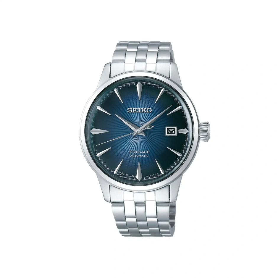 カクテルを思わせる艷やかなカラーダイヤルが特徴の「カクテルコレクション」には、カクテルグラスのステムのような細く 美しいインデックスが配されています。ボックスガラスのクラシカルなデザインに 職人技による曲げ針を採用しています。