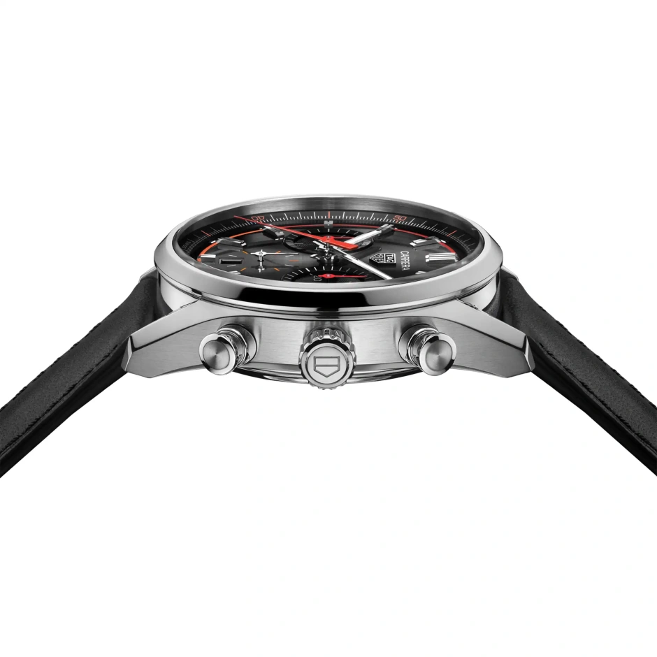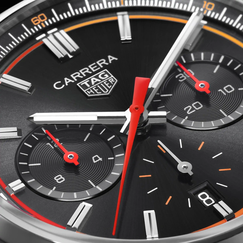 シグネチャー的なカレラのブラックダイヤルには、オレンジラッカーを施した中央針が配され、フランジのカーブに沿ったドラマチックなオレンジグラデーションのトラックとマッチ。サテン仕上げを施したエレガントな42mmサイズのステンレススティール製ケースのサファイアケースバックからは、パワフルな自社製ムーブメント「キャリバー ホイヤー02」を見ることができます。