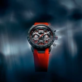 ロジウムプレートのスケルトンダイヤルにはグレイン仕上げのブラックのディテールが施され、オープンワークのカウンターには、エクストリームスポーツの鼓動を感じさせるレッドのアクセントがあしらわれています。