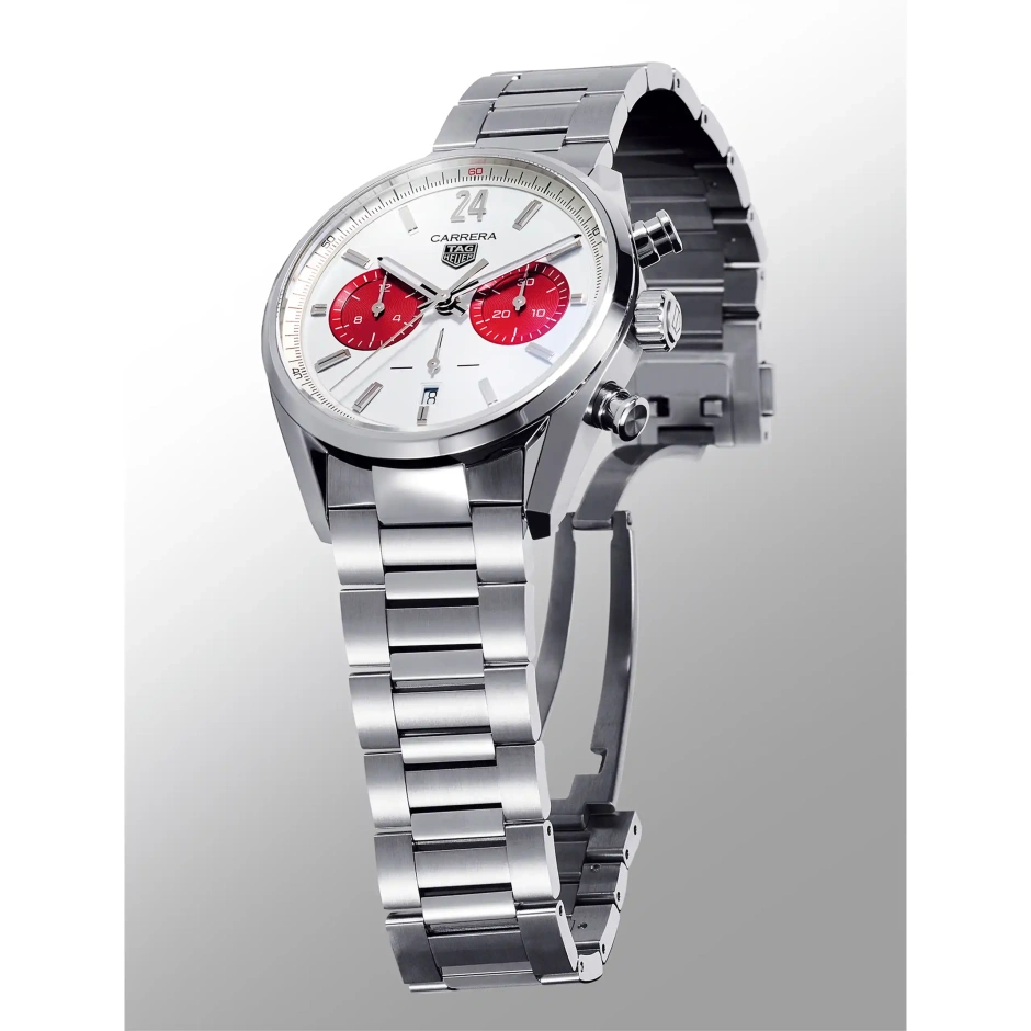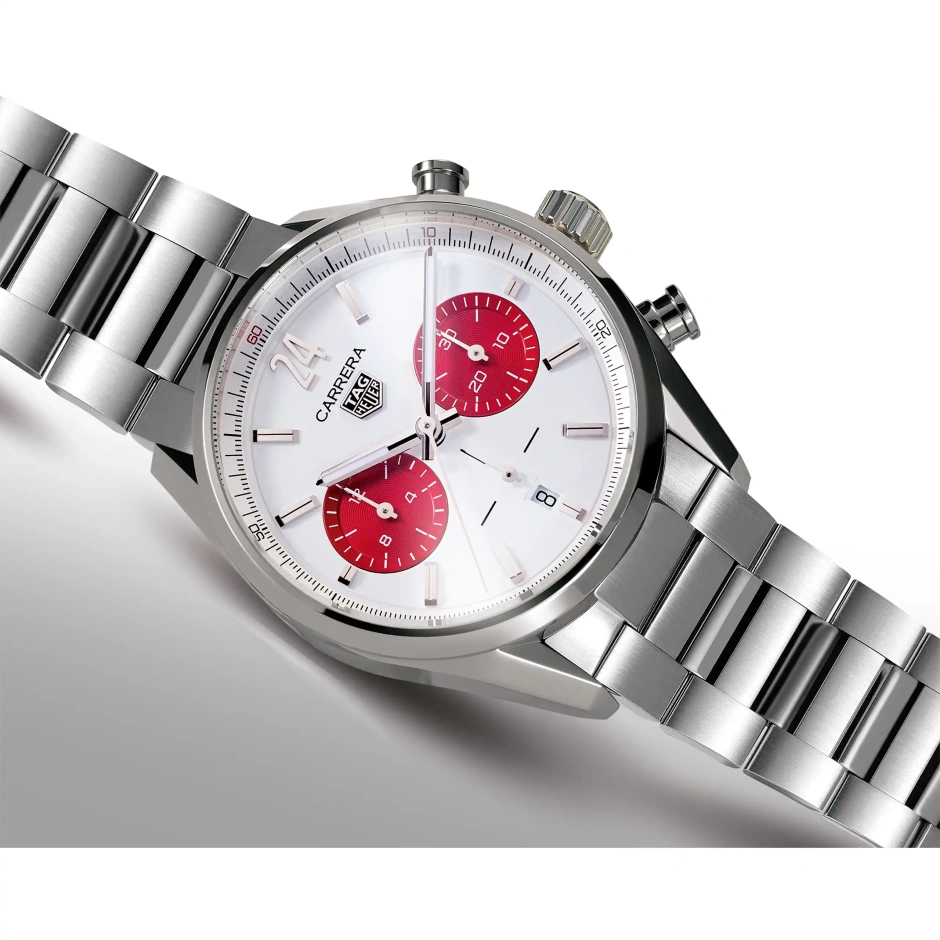 自社製自動巻クロノグラフムーブメント「TH20-00」を搭載。赤と白が織りなす紅白のハーモニーが目を惹くケース径42mmのダイヤルが、親和性を携えながら、あらゆるシーンにエレガンスを放つタイムピースです。