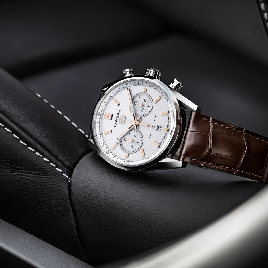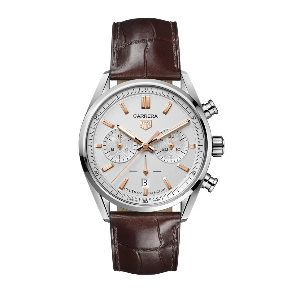 印象的なストラップから5Nローズゴールドプレートでアクセントがつけられたダイヤルまで、まさにアイコニックなクロノグラフと呼ぶにふさわしい42mmの洗練されたウォッチには、世界に誇るスイスの時計製造における実績とモダンエレガンスとが融合しています。自社製ムーブメント キャリバー ホイヤー02を搭載したフルレンジのクロノグラフ機能。クラシックなタグ・ホイヤー カレラのケースにエレガントに収められています。