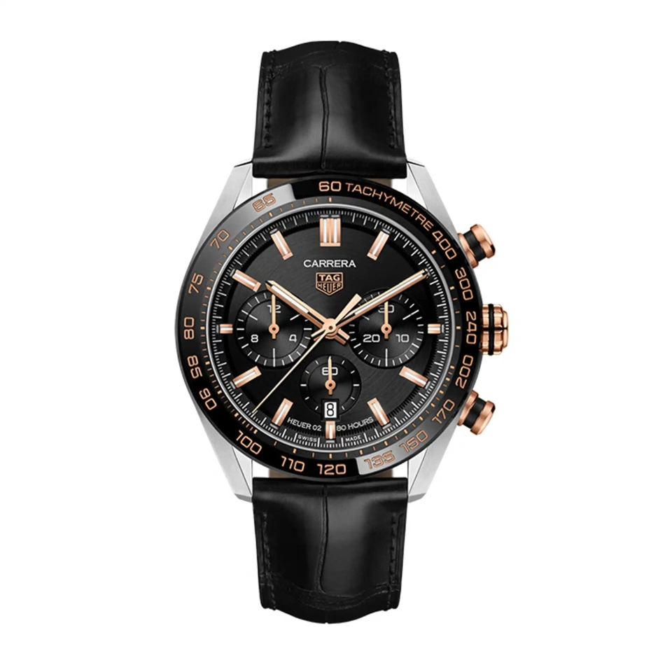 ラグジュアリーなブラックとローズゴールドで、新しいスポーティでエレガントなデザインを作り出しています。44mmのステンレススティール製ケースは、ポリッシュとサテン仕上げが相互に施され、時計をさらに薄くスマートに見せています。 約80時間という驚異的なパワーリザーブを実現する自社製ムーブメント「キャリバー ホイヤー02」を搭載。リューズとプッシュボタンには18Kローズゴールドが使われ、ストラップにはクラシックなブラックレザーを採用しています。