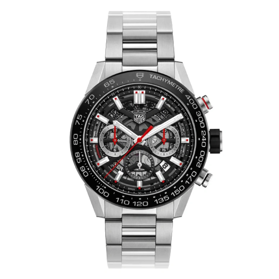 45mmの堂々としたサイズ感のケースに、ブラックのダイヤルと固定式セラミックベゼルを組み合わせた、ステンレススティール製のタグ・ホイヤー カレラ。ビッグフェイスには複雑な内部機構が見えるオープンワークダイヤルを採用。自社製ムーブメントに施された精緻な職人技を堪能することができます。