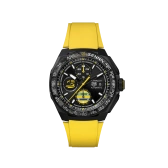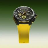 セナのレガシーを象徴するイエロー、ブルー、グリーンの色合いでアクセントがつけられたブラック サンレイダイヤル。鮮やかなイエローのラッカー仕上げが施されたセンター針とサブダイヤルのディテールに加えて、超高速のモーターレーシングで求められる要件を満たすよう設計された44mmのブラックDLCチタン製ケースとフォージドカーボン製ベゼルが、耐久性と軽量感の両立を見事に実現。