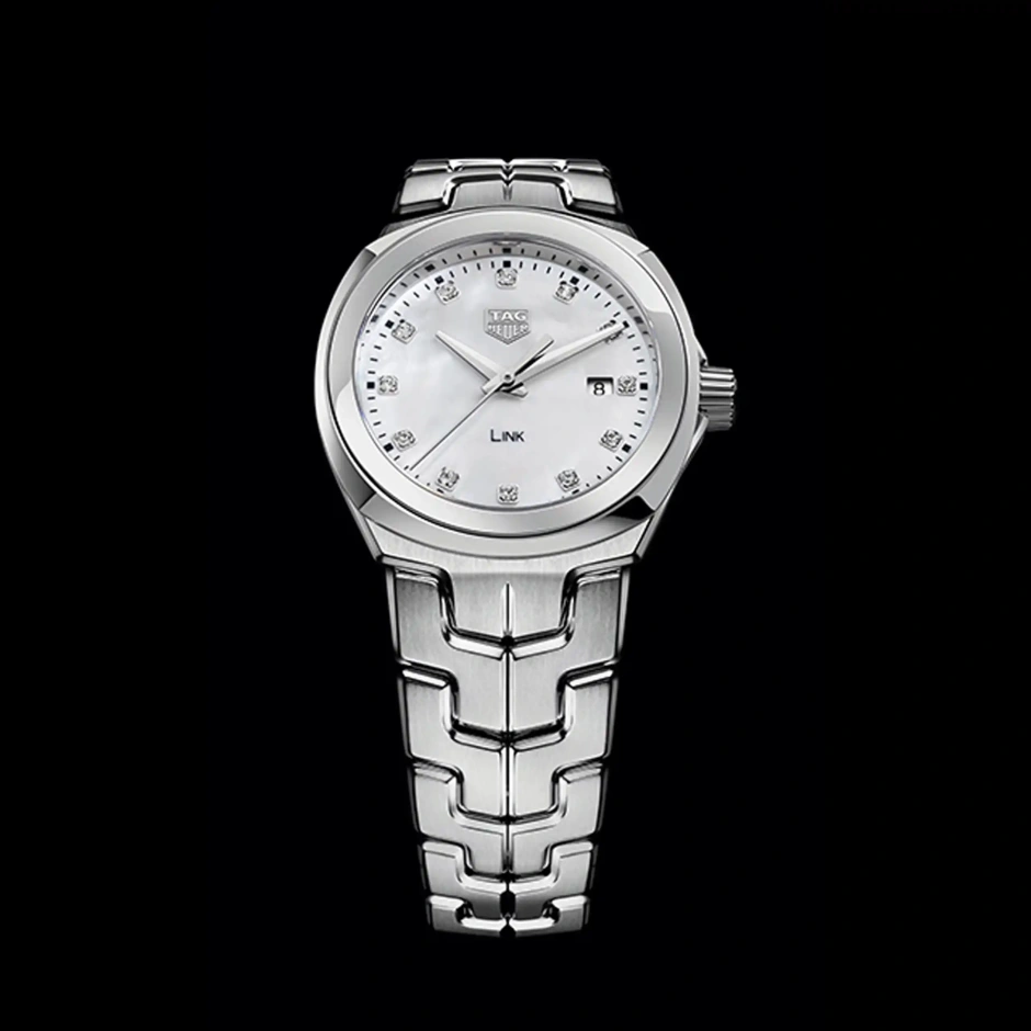 魅力的でフェミニンなダイヤモンド(0.116 CT) クォーツ エディションのタグ・ホイヤー リンク デイトにはホワイトのマザー・オブ・パールのダイヤルを採用。スレンダーな32mmケースにはサテン/ポリッシュ仕上げステンレススティールを使用し、それにマッチするポリッシュ仕上げスティール製ベゼルとアイコニックなS型ブレスレットを組み合わせています。