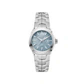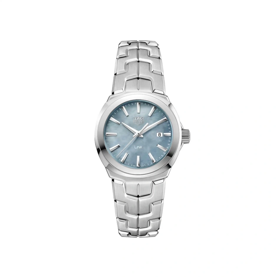 タグ・ホイヤー リンクは、ブレスレットのデザインから出発した唯一のコレクション。マザー・オブ・パールのダイヤルは手首の角度によって、トーンの異なるブルーの彩りを見せてくれます。シルバートーンのインデックス、針そして12時位置のタグ・ホイヤーを象徴するロゴが、はっきりとしたコントラストを描きます。