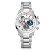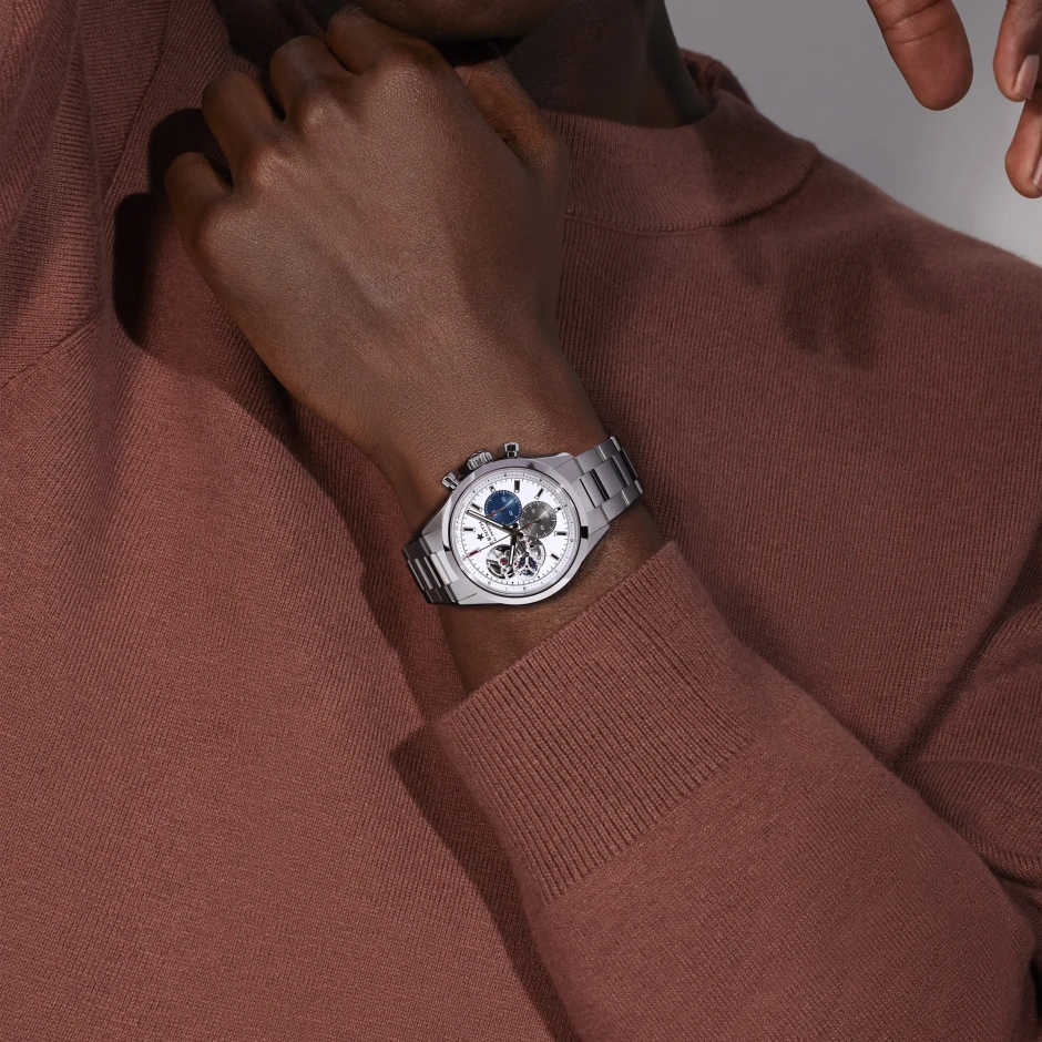 ゼニスの代名詞ともいえる傑作ムーブメント「エル・プリメロ」の魅力が存分に詰まったフラッグシップの新作モデル。1/10秒の精度を備えた「エル・プリメロ3604」キャリバーを搭載し60時間パワーリザーブを実現。直径39.5mmのユニセックスなケースサイズに、オープンデザインの文字盤からシリコン製のアンクルとガンギ車をはじめ繊細で息をのむ美しさの高振動ムーブメントの調速機構を鑑賞することができます。