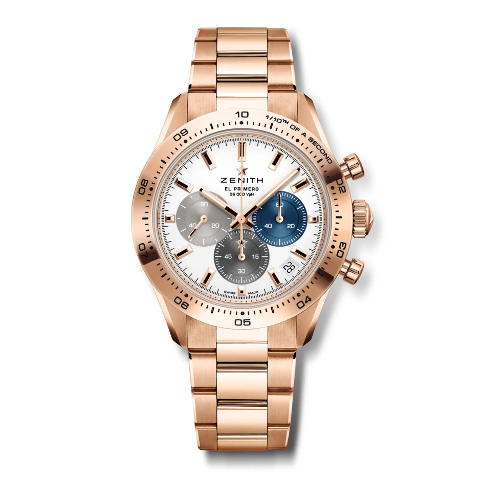 ローズゴールド製のクロノマスター スポーツ。ホワイトの3色文字盤、ポンプ型のプッシュボタン、ゴールドブレスレットなど、歴代のゼニス・クロノグラフの要素を現代的な41mmスチール製ケースに組み込んでいます。「エル・プリメロ 3600」1/10秒精度の自動巻クロノグラフムーブメントが搭載されています。