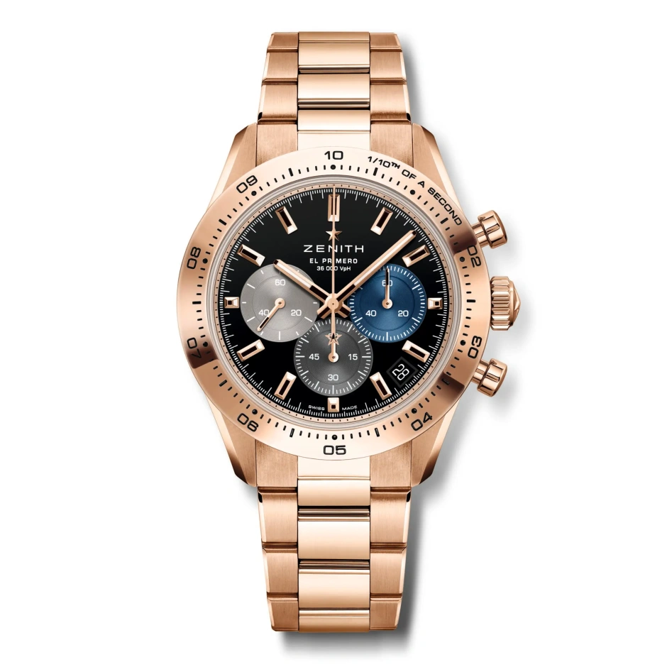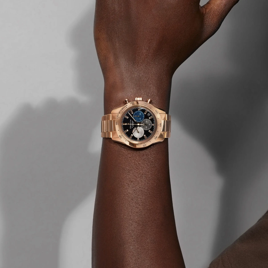 ローズゴールド製のクロノマスター スポーツ。ブラックの3色文字盤、ポンプ型のプッシュボタン、ゴールドブレスレットなど、歴代のゼニス・クロノグラフの要素を現代的な41mmスチール製ケースに組み込んでいます。「エル・プリメロ 3600」1/10秒精度の自動巻クロノグラフムーブメントが搭載されています。