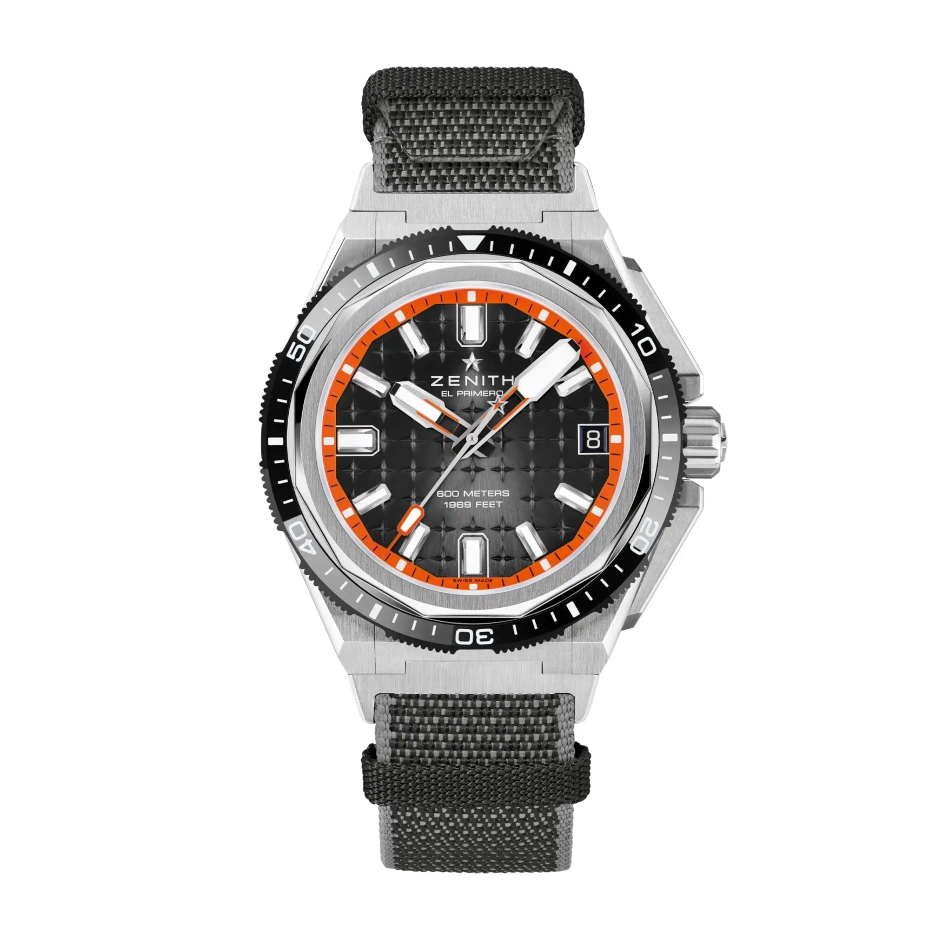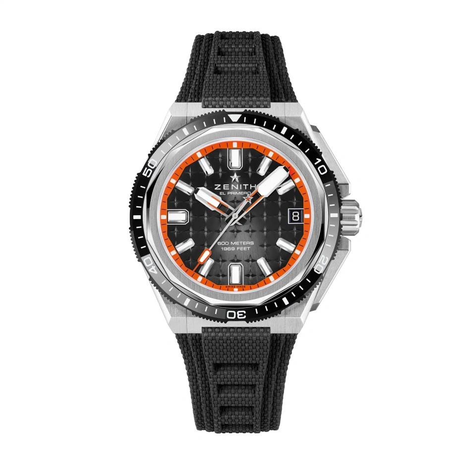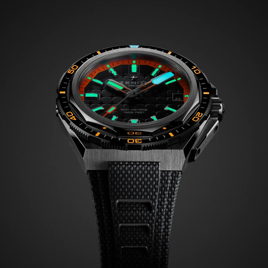 42.5mmの角張ったチタン製のケースが目を引く「デファイ エクストリーム ダイバー」。ブルーセラミック製回転ベゼルとヘリウムエスケープバルブ、60気圧の防水機能を備えています。星空を描いたブルー文字盤には、夜光塗料を塗布したマーカーと針が配されています。約60時間のパワーリザーブを備える「エル・プリメロ 3620 SC」自動巻ムーブメントを搭載。