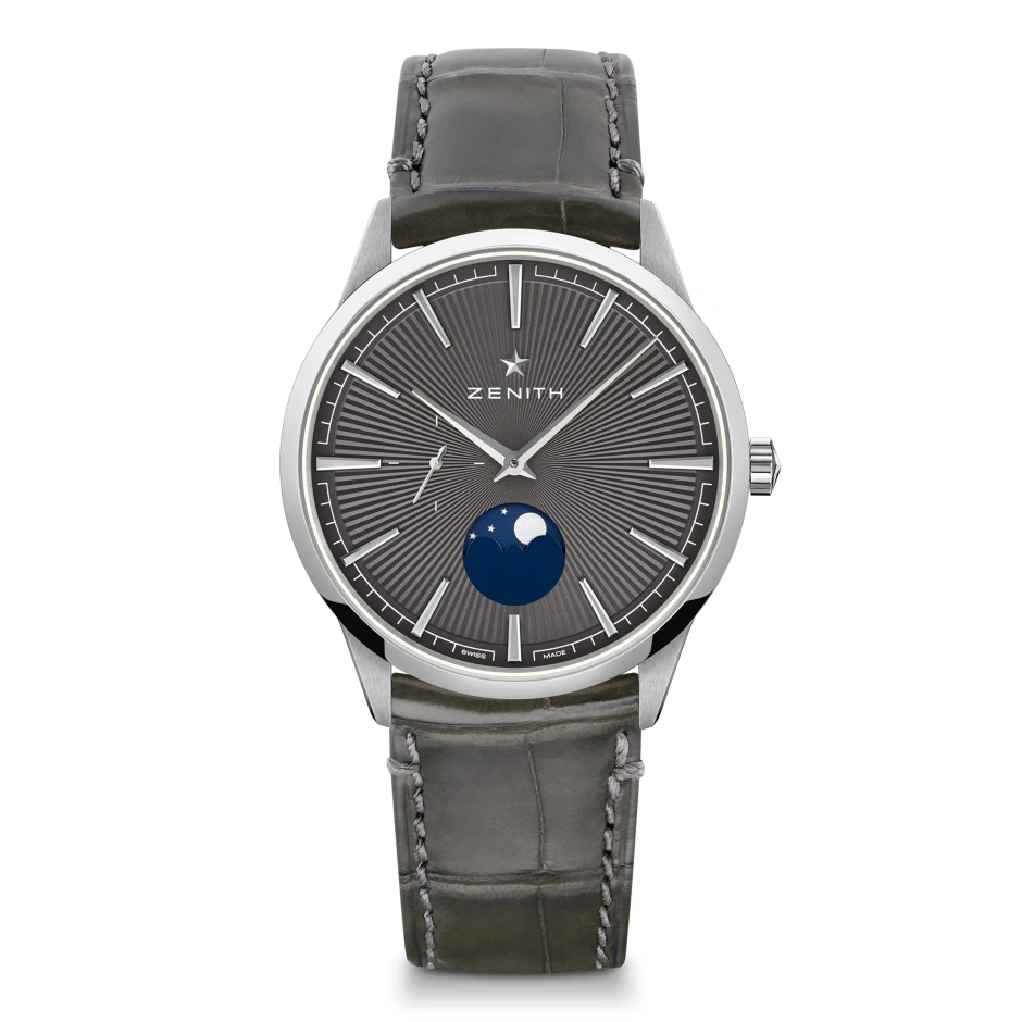 現代的なエレガンスを表現するシンプルでスマートなタイムピース。超薄型のエリートキャリバーを搭載し、洗練された佇まいに立体的なサンレイパターンの文字盤とポリッシュ仕上げが美しいドルフィン針が時を刻みます。ラバーを裏打ちしたアリゲーターベルトも日常使いに最適です。ムーンフェイズの下半分にはディスクと同色のミッドナイトブルーを採用。月や星々を際立たせます。