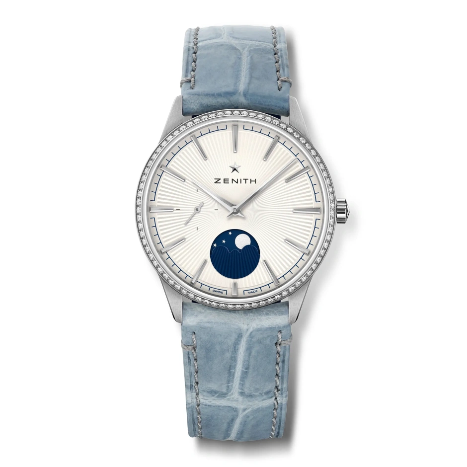 現代的なエレガンスを表現するシンプルでスマートなタイムピース。超薄型のエリートキャリバーを搭載し、洗練された佇まいに立体的なサンレイパターンの文字盤とポリッシュ仕上げが美しいドルフィン針が時を刻みます。ラバーを裏打ちしたアリゲーターベルトも日常使いに最適です。ムーンフェイズの下半分にはディスクと同色のミッドナイトブルーを採用。月や星々を際立たせます。