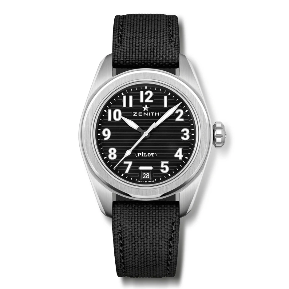 ゼニスのパイロットウォッチの新世代モデルであるパイロット・オートマティック スチールモデルは、スチール製40mmケースに大型リューズ、波型のブラック文字盤、スーパールミノバを塗布した大型のアラビア数字を備えています。ムーブメントには自社製造の高振動エル・プリメロ3620自動巻キャリバーを搭載。 コーデュラ・エフェクトのブラックラバーベルトの他、交換可能なブラウンのカーフスキン・レザーストラップが付属しており、付け替えをお楽しみいただけます。